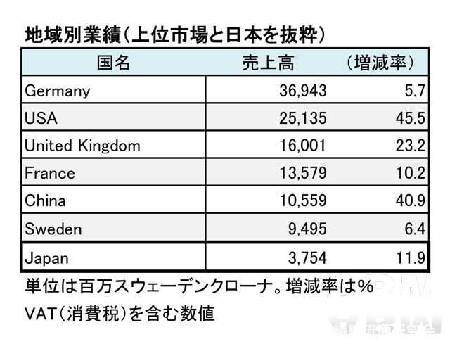 日本の会計基準で経常利益に該当する金融項目控除利益および営業利益の売上比率は15%前後と高い水準を保っている。当期純利益も11.6%と2ケタ台である。地域別の業績は、Germany(独)が369億4,300万スウェーデンクローナ(5,172億200万円)、5.7%増と堅調な推移。日本地区は37億5,400万スウェーデンクローナ(525億5,600万円)、11.9%増と2ケタ増だった。
