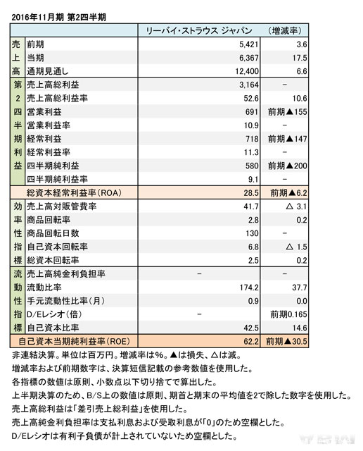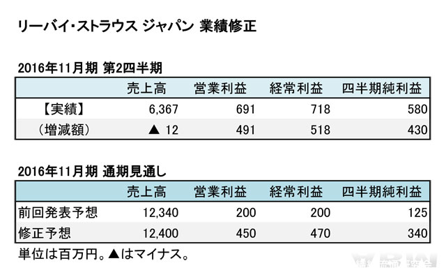 リーバイ・ストラウス ジャパン、2016年11月期 第2四半期