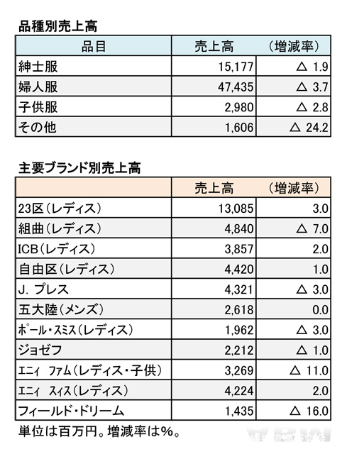 ブランド別では、「23区」「ICB」「自由区」などのレディスブランドが健闘した(表2参照)。3ブランド共に前年同期はマイナスだったが、今期はプラスに転じている。メンズの「五大陸」はほぼ前年並み。レディス・子供の「エニィ ファム」が2ケタ減と苦戦した。