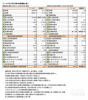 当期から、国際会計基準(IFRS)を適用したため、前期までの日本会計基準による決算数値と単純比較ができない。参考に、日本会計基準による2014年3月期の財務諸表を併載した。2015年3月期の財務諸表は前年度の比較も含めすべてIFRSで計算した。日本会計基準とIFRSの数値算出方法が同一でないため、別表の決算数字は参考値として参照されたい。類似する項目および該当数値を使用し、各指標を計算した。詳細はまとめて欄外に注釈を付けている。なお日本会計基準では、当期利益が約7億円と黒字化を達成した。