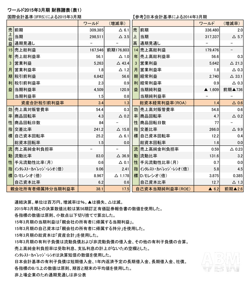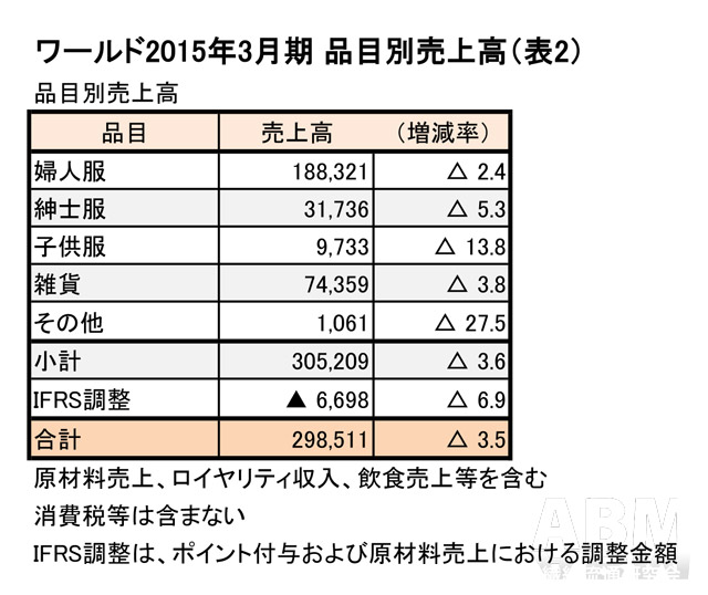 ワールドの2015年3月期連結決算(非上場)は、各部門で売り上げが減少したが、利益は確保した。昨年4月の消費増税の影響が大きかったほか、円安の為替もコスト高につながった。また、企業体の抜本的な立て直しを図るため、2016年3月期を初年度とする3カ年計画を策定し、再成長を目指す。