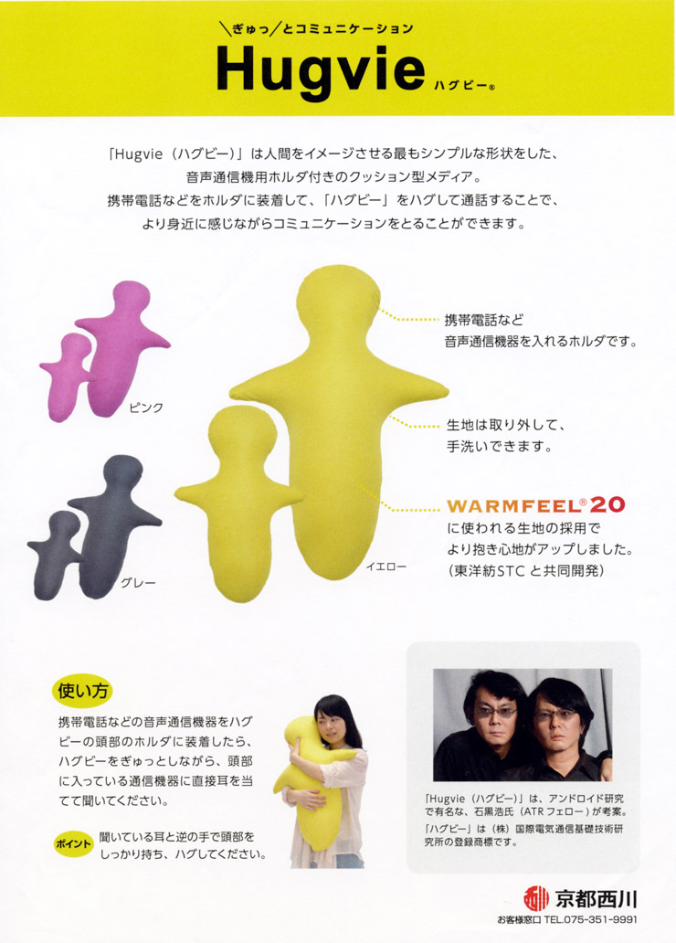 ㈱京都西川(本社:京都市下京区、社長:大河内 徹心)は、ぎゅっとコミュニケーション「ハグビーⓇ」を2015年9月初旬から発売する。「ハグビーⓇ」とは、㈱国際電気通信基礎技術研究所(本社:京都府相楽郡、社長:平田 康夫、以下、ATR)の石黒 浩ATRフェローらが中心となって開発したヒトをイメージさせる最もシンプルな形状をしたクッション型コミュニケーションメディアだ。