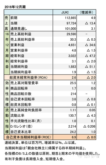 JUKI 2016年12月期 本決算