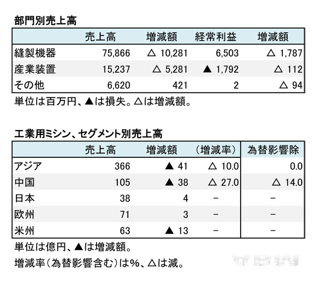 「縫製機器」に含まれる主力の工業用ミシンでは、「アジア」全体において新興国で伸び悩んだが、為替の影響を除けば前年並みと堅調な推移だった(表2を参照)。「中国」の売上比率が下がったが、日本および欧州は健闘した。