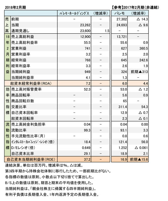 当期から持株会社体制へ移行したパレモ・ホールディングスの2018年2月期連結決算は、主力のアパレルが苦戦したが、利益は確保した。前年比がないため、単純比較はできないが、減収・増益の傾向だった。