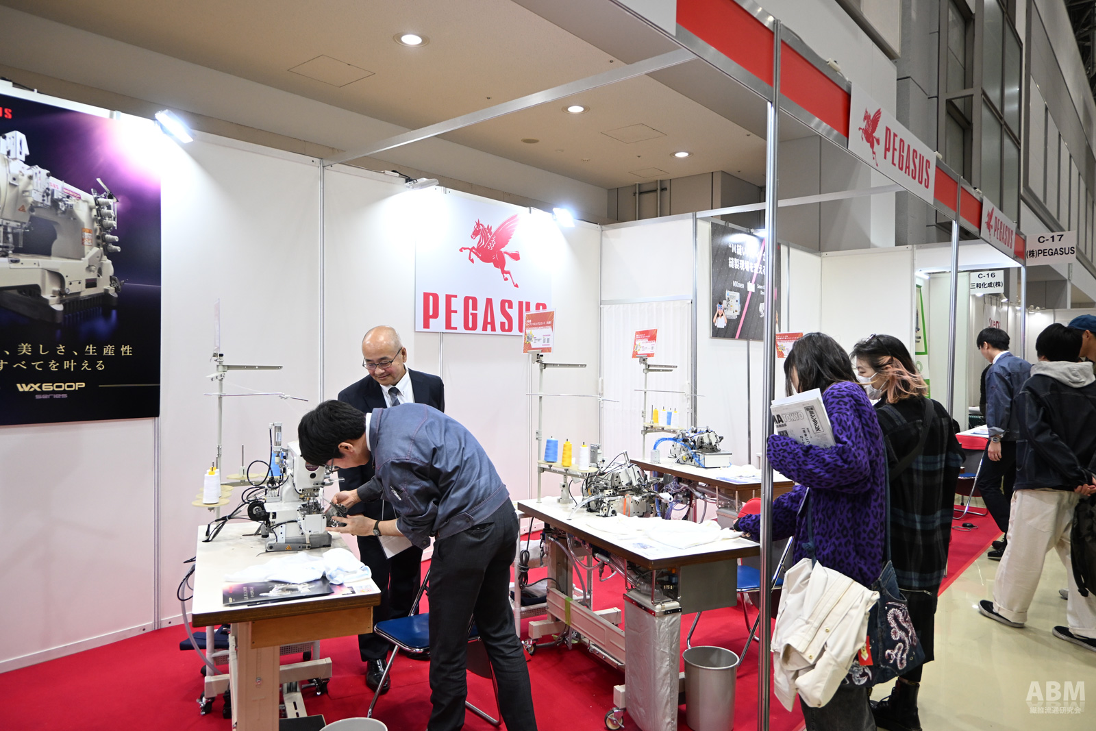 縫製する際に高いテクニックが要求されるカットソー縫製において、縫製職人にそこまでのスキルがなくても一定の品質で縫い上げることができるミシンを主に出品しているペガサス。今回は、スポーツウェア、インナーウェアなどで最近よく見かける縫い目を開いて見せて縫い代部分を薄く柔らかくする“M縫い”を、安定した品質でスピーディに縫うことができるセットを紹介。