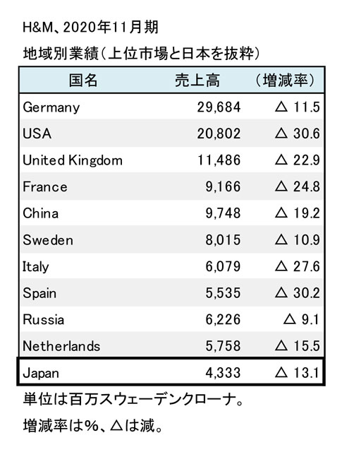 「H&M」などSPA業態の小売店を展開するH&M(Hennes & Maurits=ヘネス&マウリッツ)グループの2020年11月期の連結決算は、長引くコロナ禍の影響が足を引っ張り、2ケタの減収減益となった。第2四半期(3-5月)で大半の店舗(全体の約80%)の閉鎖を余儀なくされたことが大きなマイナスになった。第3四半期(6-8月)後半から回復基調に乗り、第4四半期で前年並みに戻ったが、期末にかけて伸び悩んだ。