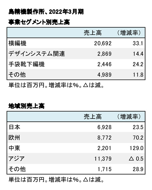 期末の「横編機」の販売台数(連結ベース)は4,363台(342減)。うち、「ホールガーメント®」は920台(156増)と好調に推移した。地域別の売上高は、「アジア」を除いた全地域で増収を達成した。