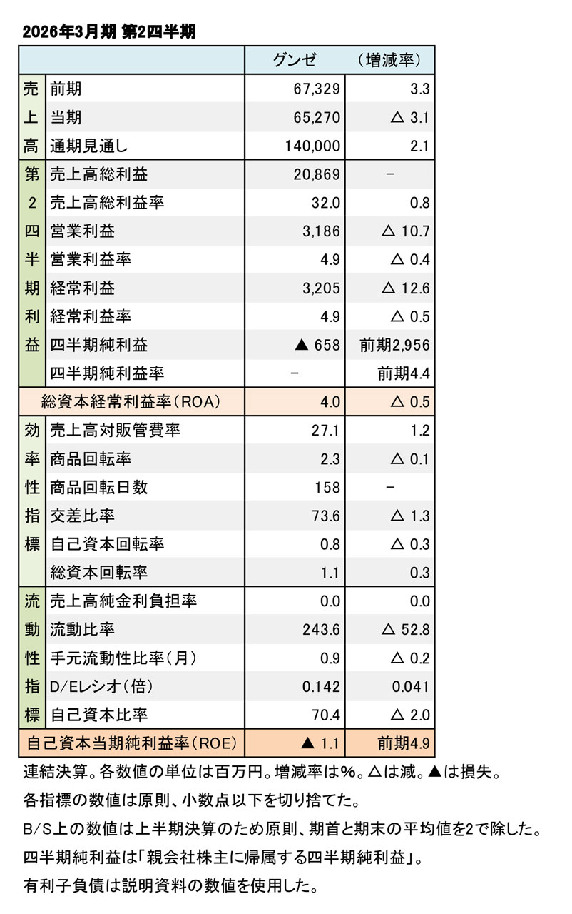 グンゼの2026年3月期 第2四半期 連結決算は「機能ソリューション」などの苦戦で減収、コスト増が影響し減益となった。新規分野の「メディカル」は横ばい、「アパレル」は微減収。在庫縮小などの影響を受けて、減益に至った。