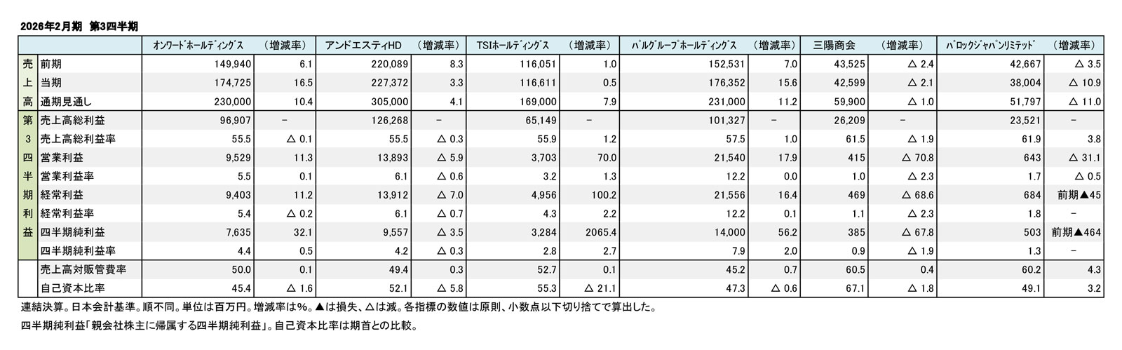 対象にした企業はオンワードホールディングス、アンドエスティHD(旧アダストリア)、TSIホールディングス、三陽商会、パルグループホールディングス、バロックジャパンリミテッドの6社(順不同)。いずれも2025年11月末に第3四半期を迎えた企業だ。各社の第3四半期連結決算の業績を表1にまとめているので参考にされたい。