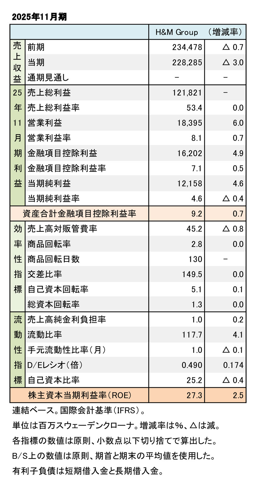 「H&M」などSPA業態の小売店を展開するH&M(Hennes & Maurits=ヘネス&マウリッツ)Group(H&Mグループ)の2025年11月期の連結決算は減収、微増益となった。店舗数が減少した影響もあり、効率化は進んでいる。