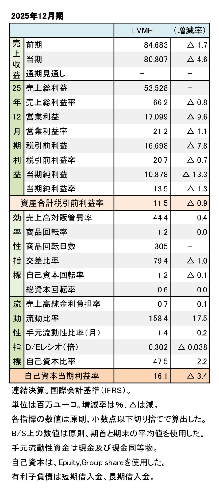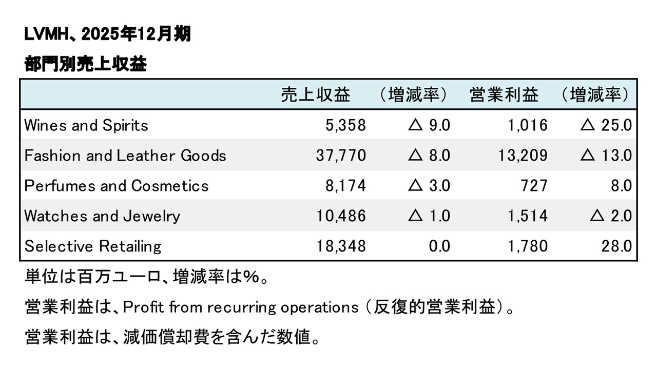 LVMH(モエ ヘネシー・ルイ ヴィトン)グループの2025年12月期(2025年度)連結決算は、各カテゴリーで減収し、減収減益に至った。為替変動の影響があった。第4四半期(10-12月)は堅調な推移だった。主力の「Fashion and Leather Goods」(ファッション・皮革製品)が減収減益と伸び悩んだ。「Perfumes and Cosmetics」(香水・化粧品)は利益に貢献した。
