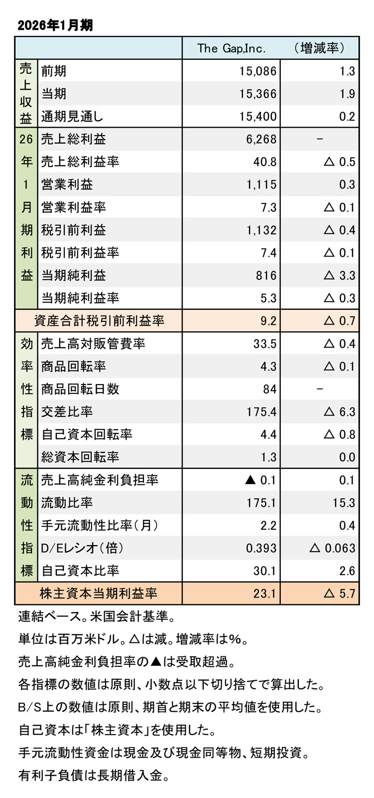 財務面では、効率性指標が低下しているが、流動性指標では改善が見られる。期末の直営店舗数は、2,474店(退32)。店舗数は減少している。北米の「Old Navy」は7減の1,242店。同「Gap」は6増の459店。アジアの「Gap」は1増の123店。通期の業績は、売上収益が154億米ドル(約2兆3,716億円、同)、0.2%増の微増収を見込んでいる。