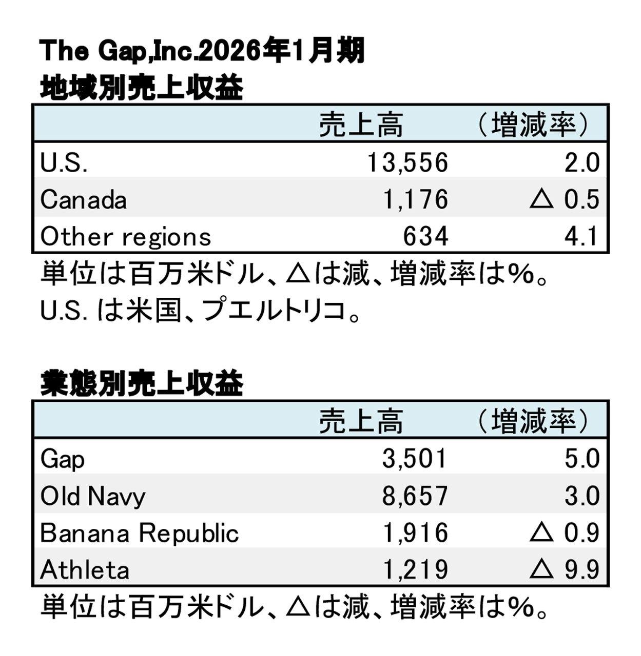 「ギャップ」や「オールドネービー」などカジュアルアパレル業態を手掛けるGap Inc,(ギャップ社)の2026年1月期の連結決算は、増収を達成した。主力業態の「Old Navy」(オールドネービー)や「Gap」(ギャップ)がけん引役になった。主力地域の「U.S.」(米国)が堅調な推移だった。営業段階で微増益となった。