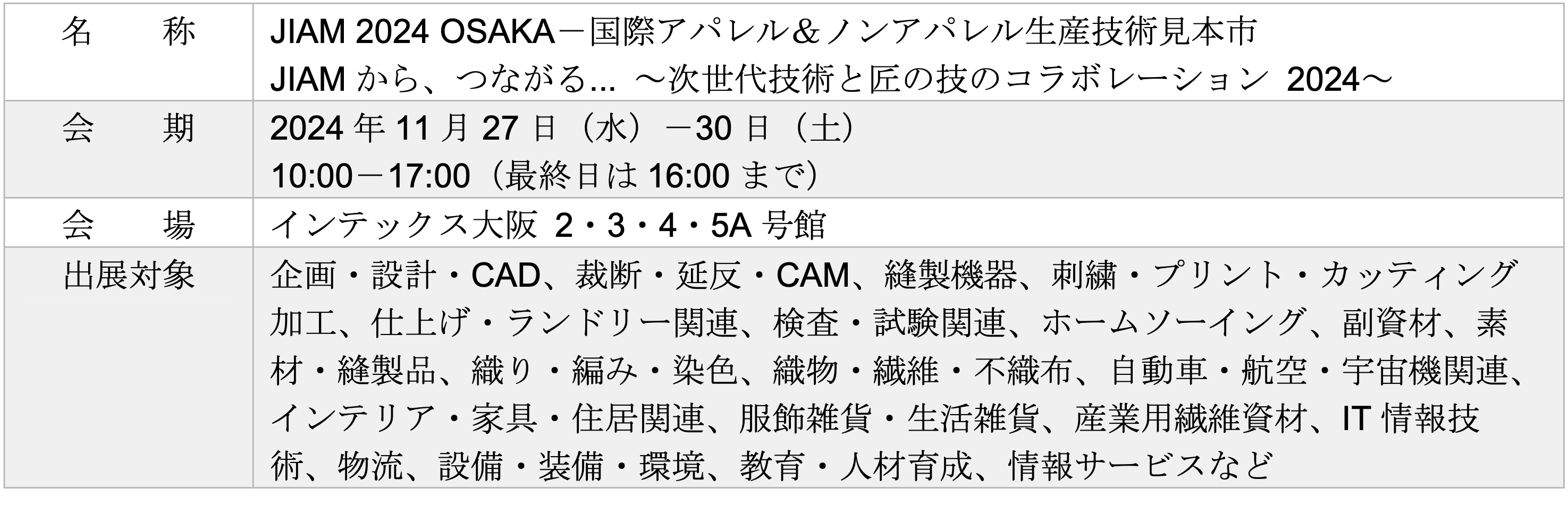 国際アパレル&ノンアパレル生産技術見本市「JIAM 2024 OSAKA」(主催:一般社団法人 日本縫製機械 工業会(以下 JASMA)が 2024 年 11 月 27 日(水)-30 日(土)の 4 日間、インテックス大阪 2、3、 4、5A 号館にて開催されます。縫製や裁断機械など繊維産業に関わる製品、技術、サービスが国内外から 集います。また、IoT や AI を活用したシステム・ソリューション、ロボット技術、CAD/CAM システムな ど、製造プロセスの自動化と効率化に焦点を当てた業界の最前線を示す場としても注目されています。