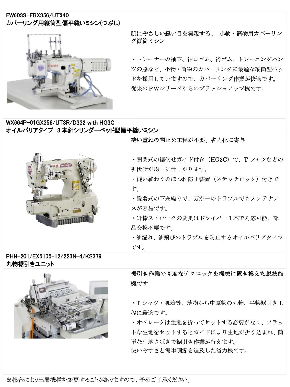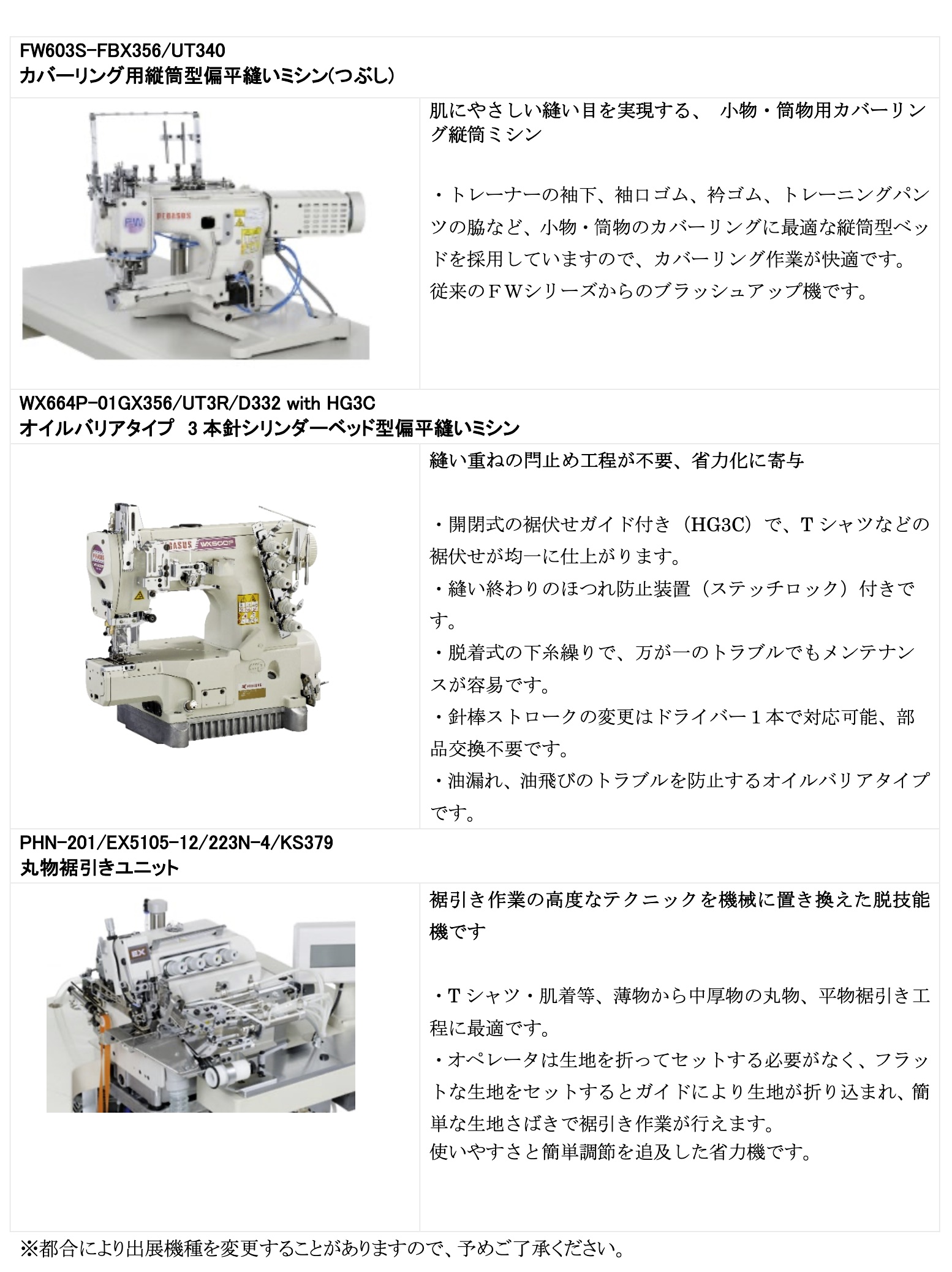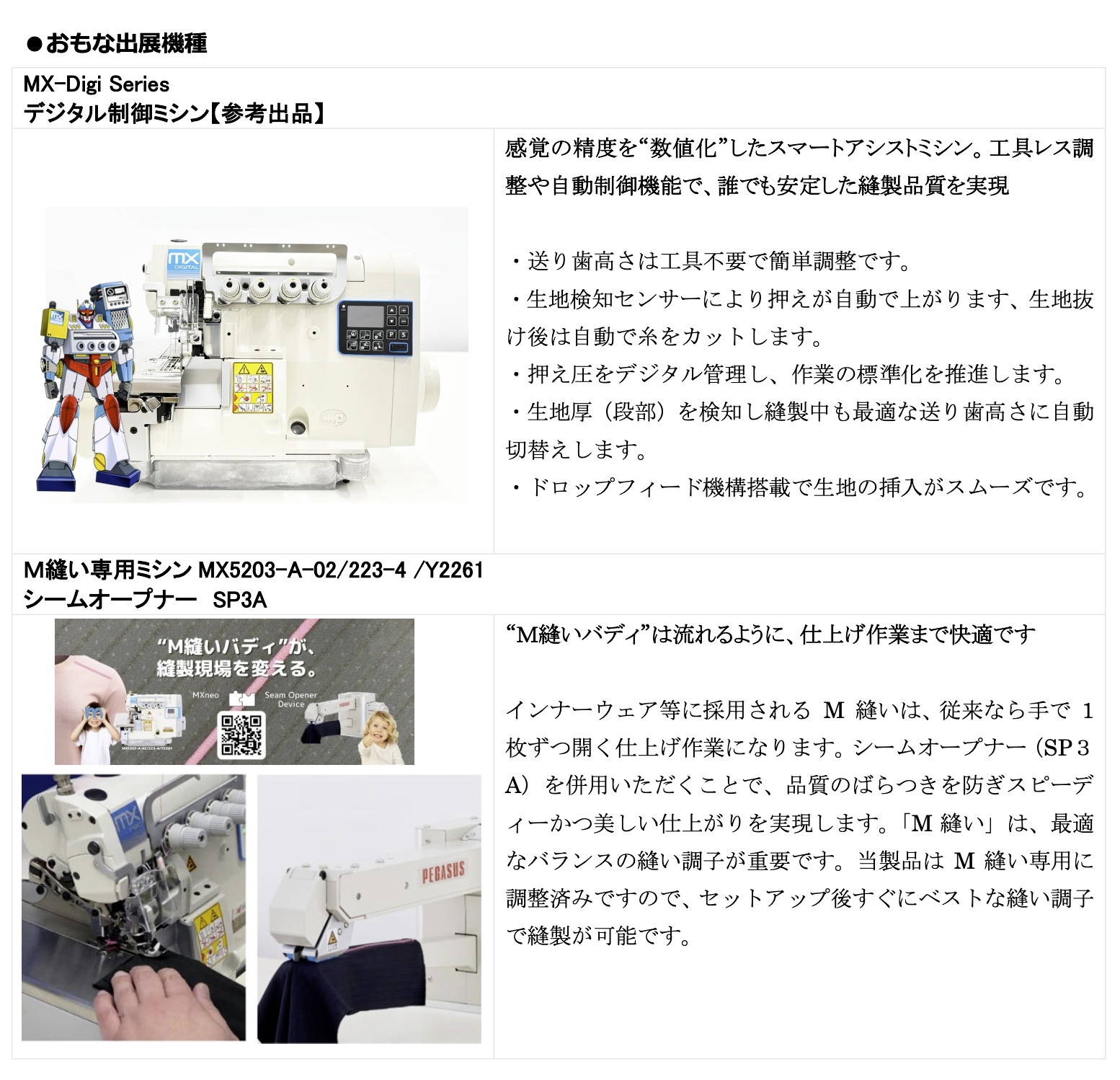 PEGASUS ブースでは縫製技量に関する課題をお持ちの現場に適した「脱技能化」 「省力化」ミシンを中心に出展します。弊社の若手社員による縫製実演と共に、品質の均一化と安定した仕上がりを可能にするミシンを商品知 識豊富な営業担当がご提案いたします。