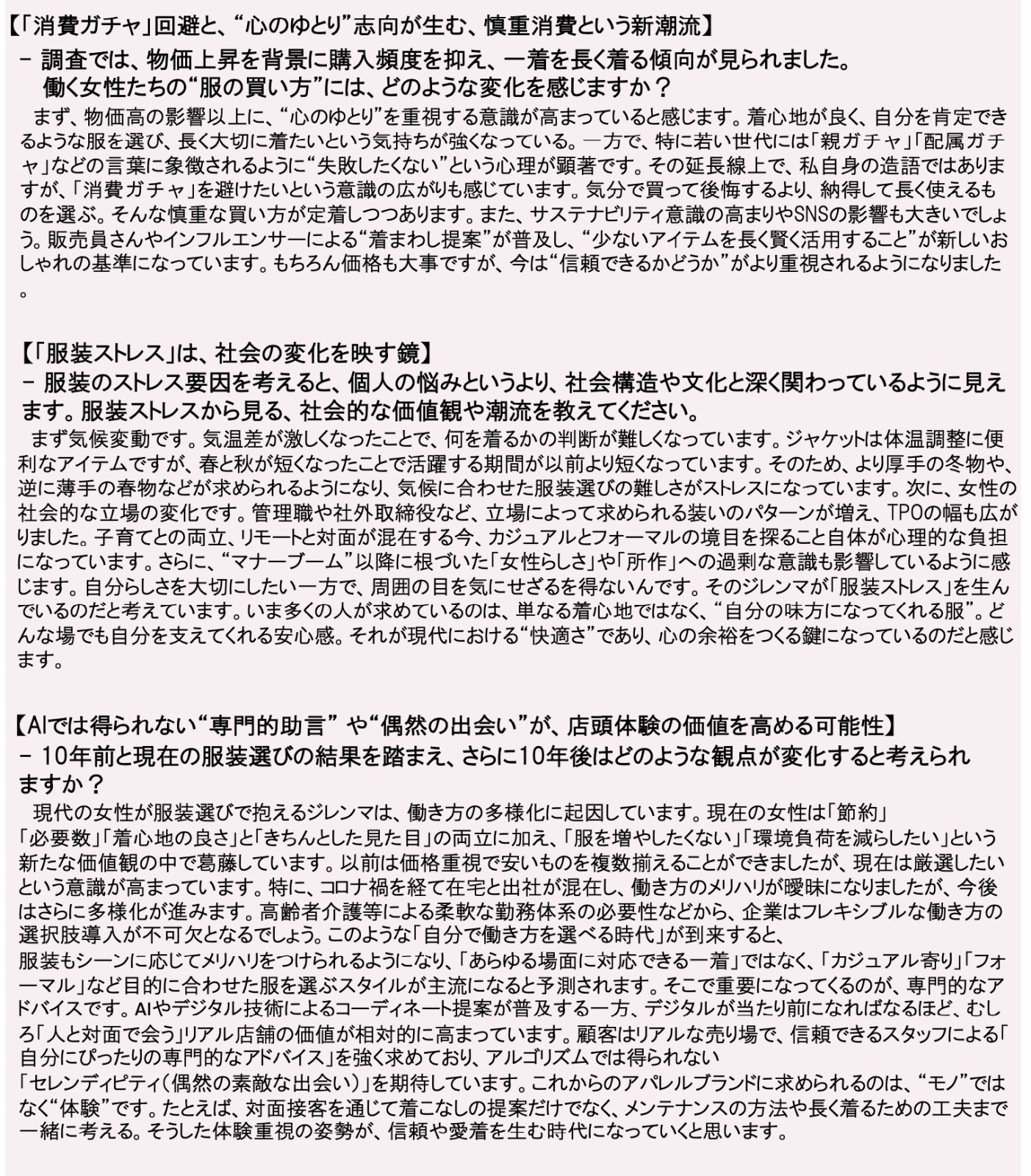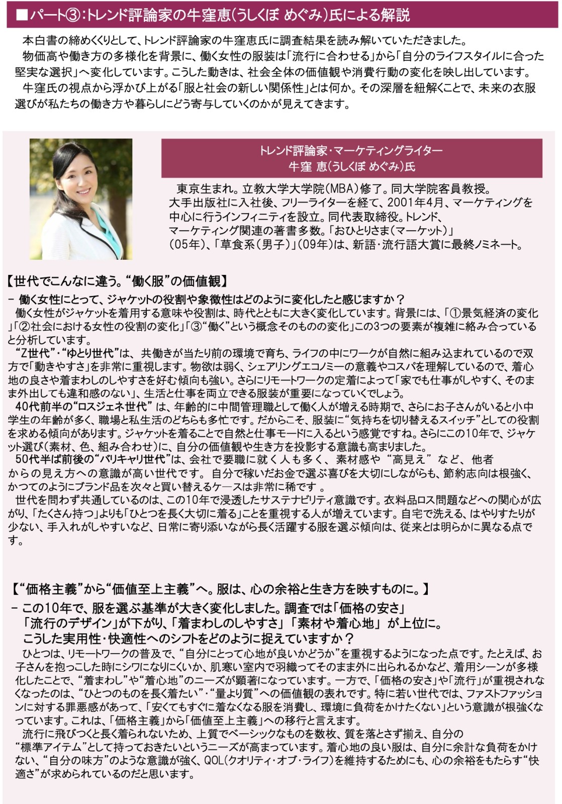 本白書では、過去10年間で変化した服装への意識や現代女性の消費行動を分析し、働く女性のリアルな声から社会の価値観の変化を明らかにします。さらに、トレンド評論家・牛窪恵氏による解説を交え、時代の変化と動向を多角的に読み解きます。