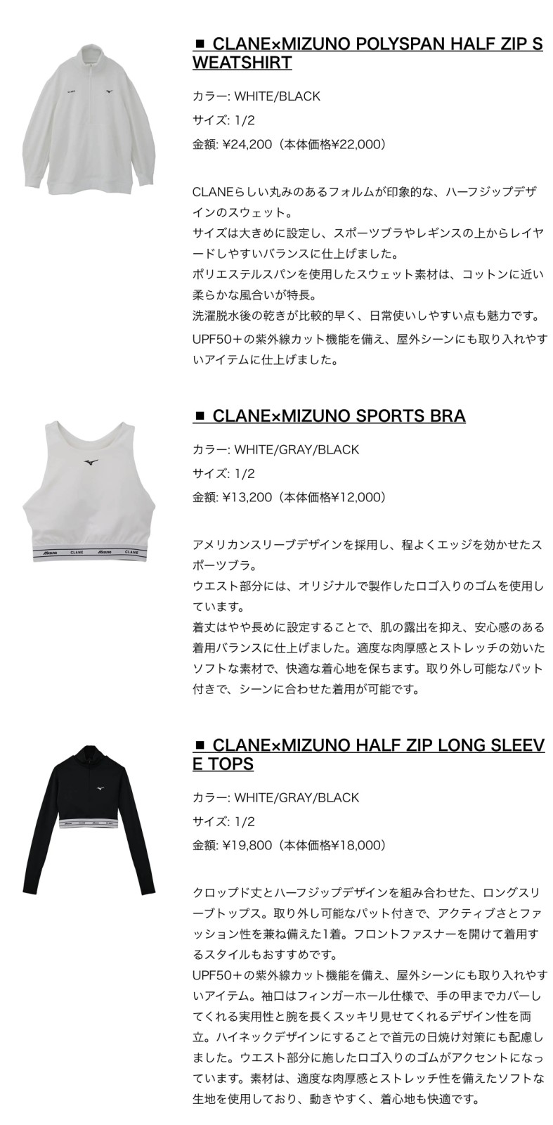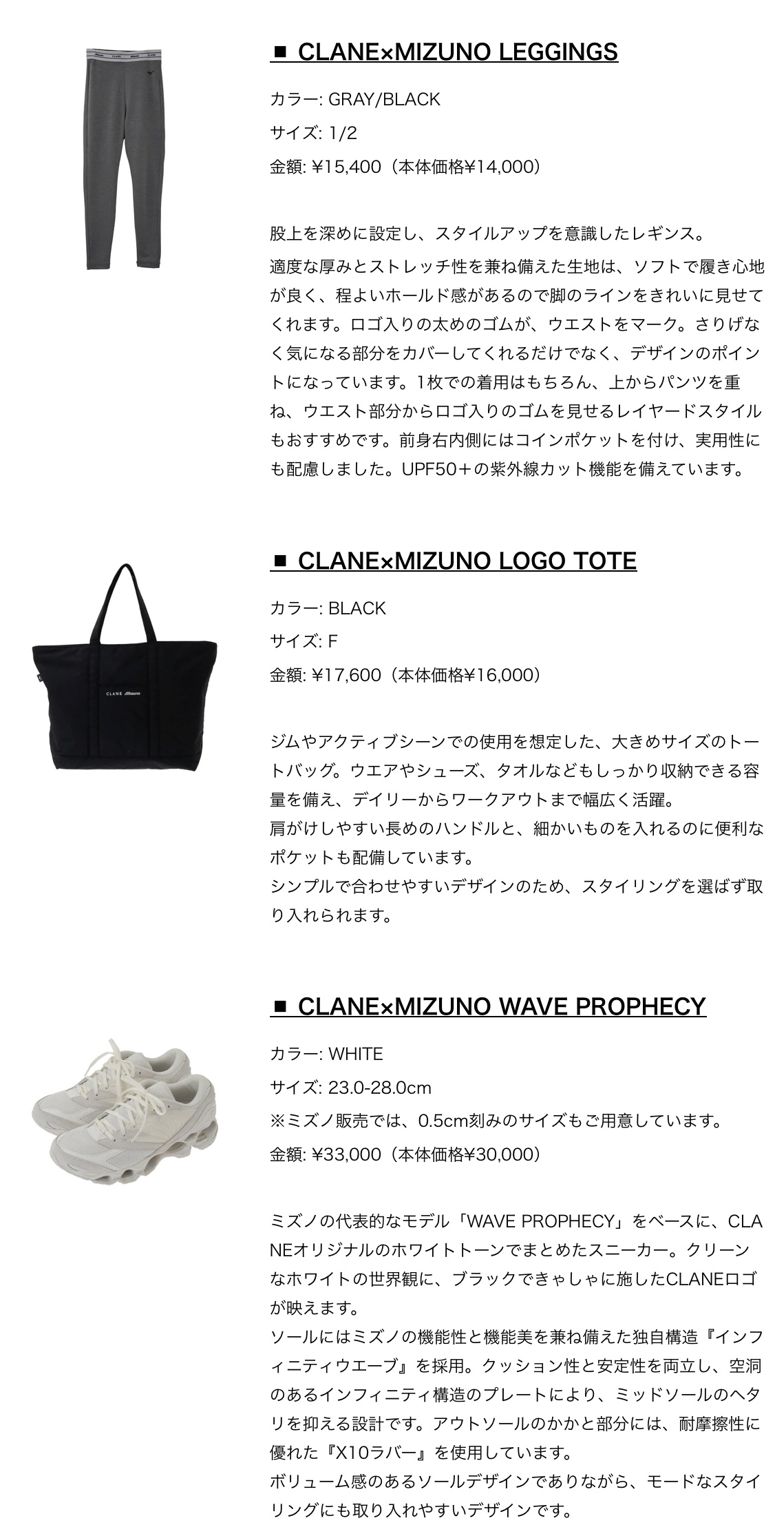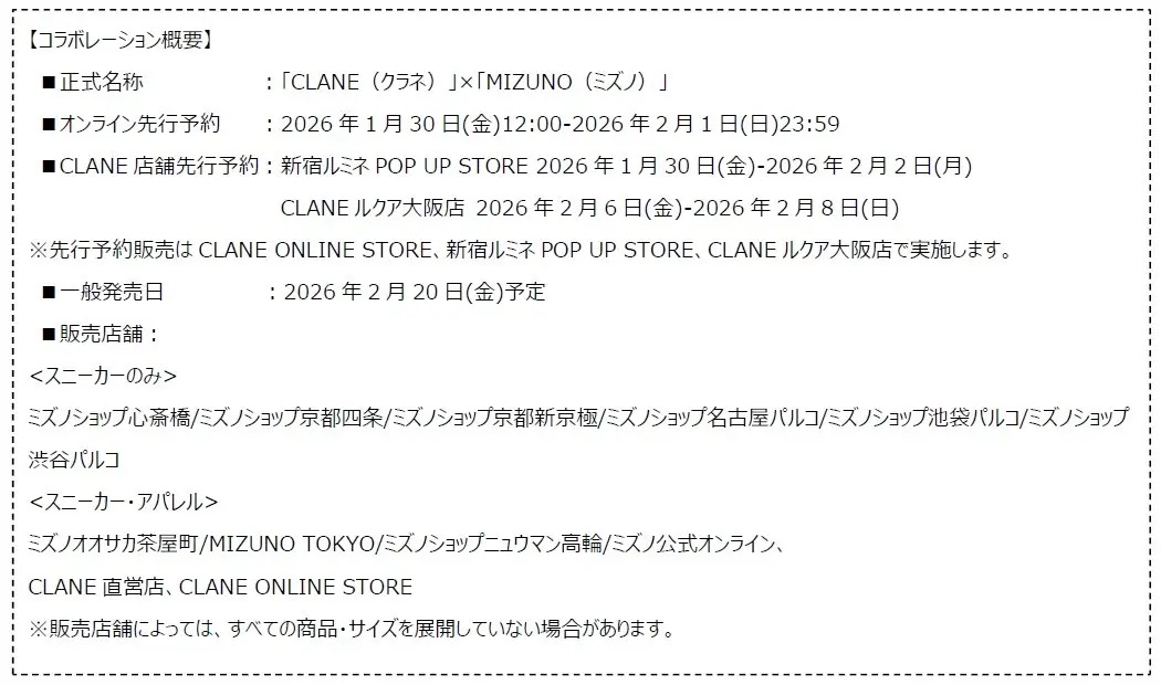 一般発売に先駆け、2026年1月30日(金)よりCLANE ONLINE STOREおよび新宿ルミネPOP UP STORE、2月6日(金)よりCLANEルクア大阪店にて、コラボレーションアイテムの先行予約販売を実施します。先行予約特典として、2点以上お買い上げのお客さまは10%オフにてお買い求めいただけます。ミズノは2026年2月20日(金)に発売開始します。