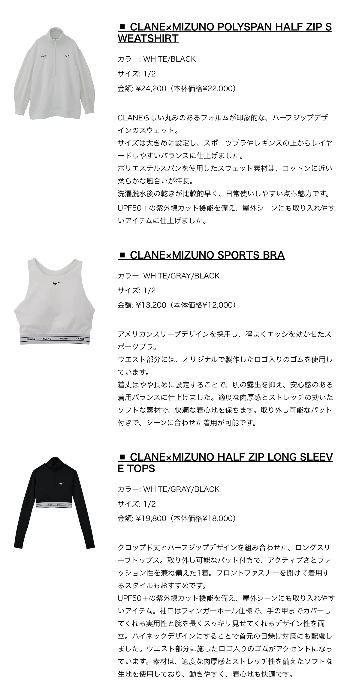 長年にわたり高い技術力を磨き、スポーツの現場で培われた知見をプロダクトに落とし込んできたミズノと、日常に寄り添うモードを軸に、丁寧なものづくりを続けてきたCLANE。両者の価値観が重なり合い、機能性とデザイン性を兼ね備えたコレクションが完成しました。