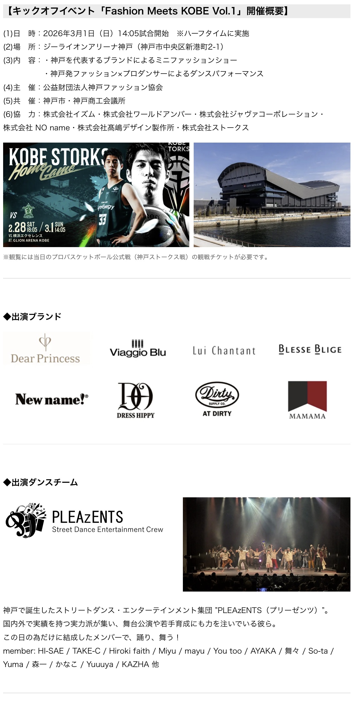 プロバスケットボール公式戦のハーフタイムショーとして、神戸を代表するブランドによるファッションショーとダンスパフォーマンスを実施します。