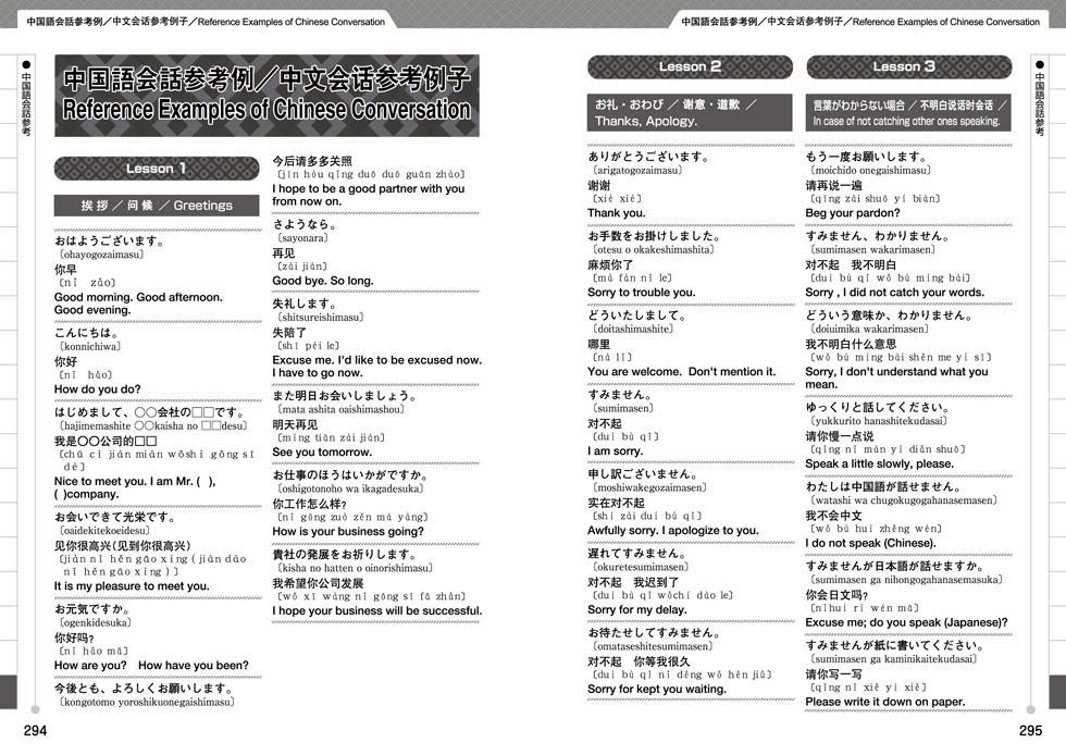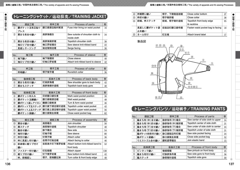 縫製用語、ニット用語、部分・寸法用語、パターンの表示記号、身体用語、服種と縫製工程、ファッション関連用語、流通関連用語、商取引関連用語、繊維の分類、一般的な織・編の種類、染色加工用語、品質.性能用語、縫製関連用語、編組機械用語、主な服種、代表的なカラー名、物流関連用語、索引(日本語・中国語・英語)資料・中国語会話参考例等