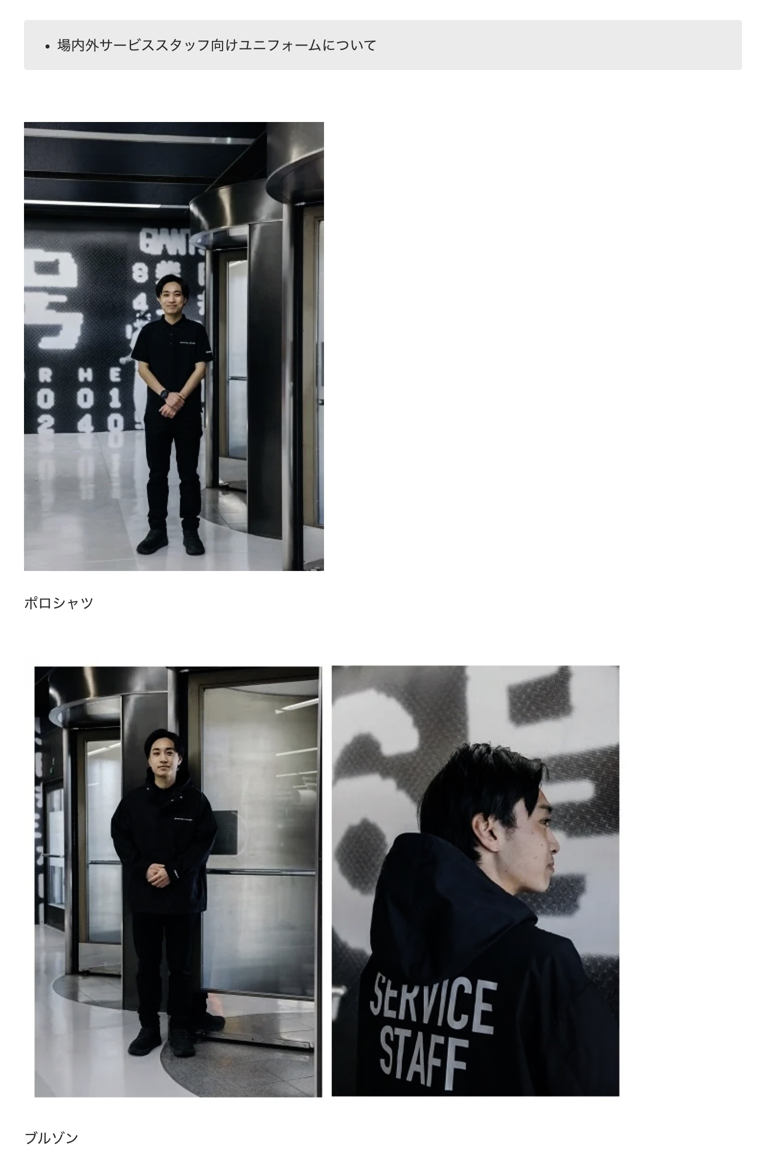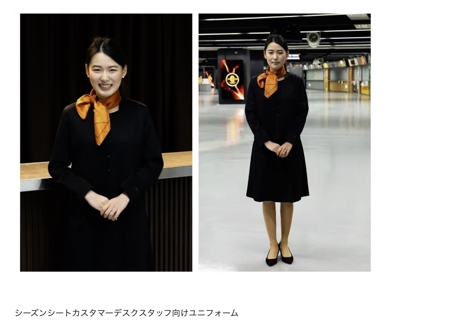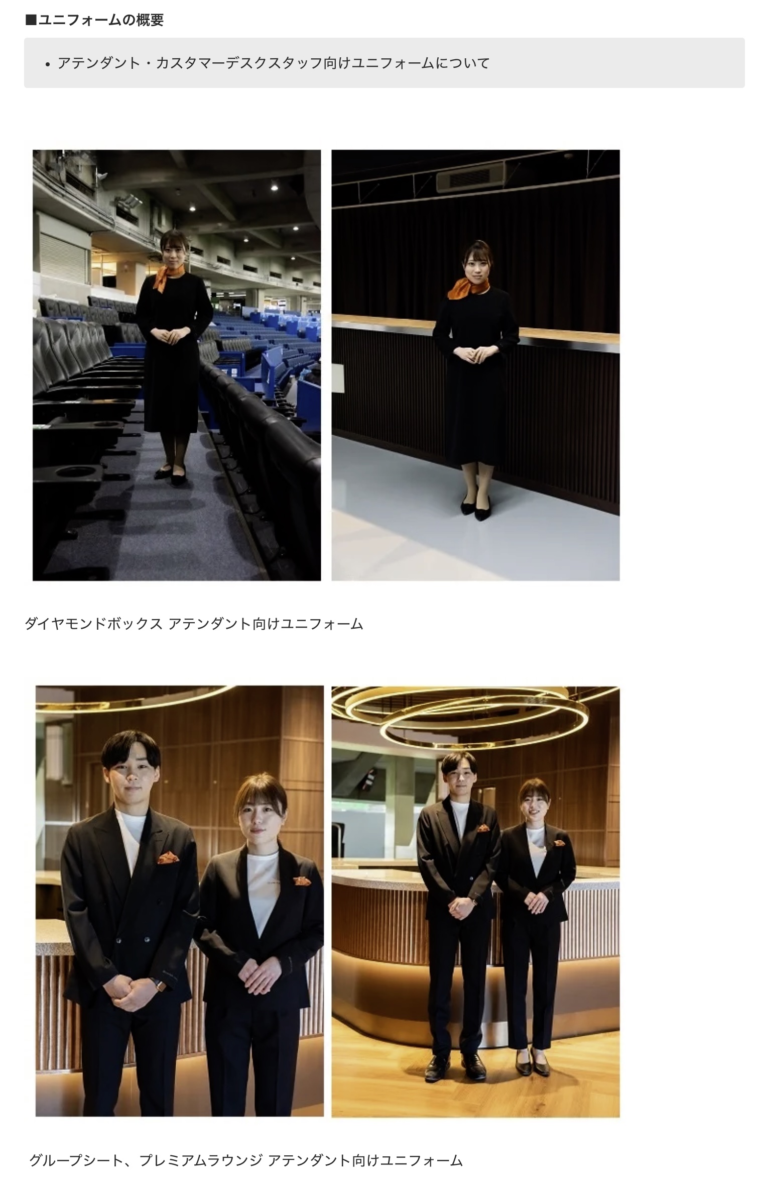 (※)アテンダントやカスタマーデスクスタッフ向けユニフォームは読売ジャイアンツ主催試合時のみ、場内外サービススタッフ向けのユニフォームは東京ドームで行われるその他各種イベントやコンサートでも使用されます。