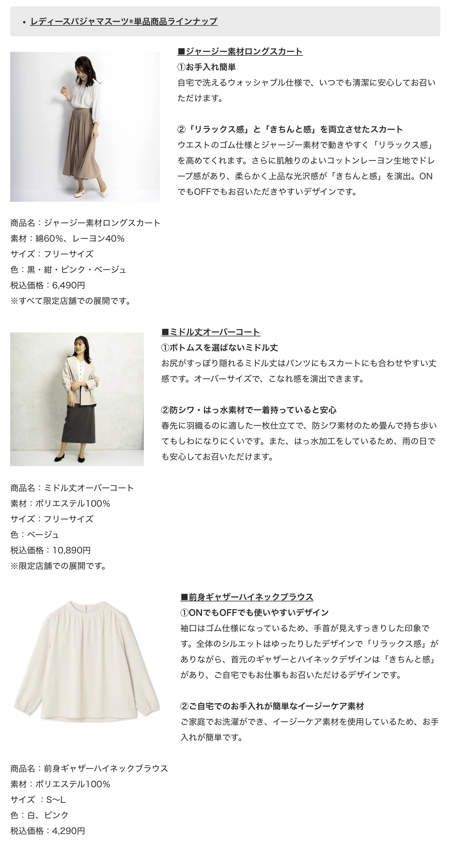 今回はレディースパジャマスーツ®に合わせやすい単品アイテムの展開です。パジャマスーツ®をはじめ、お手持ちのカジュアルアイテムとの相性がよく、ONでもOFFでも幅広く着まわせるアイテムを多数ご用意。ジャージー素材のロングスカートは、「リラックス感」がありながら、レーヨン混生地ならではのドレープ感で上品さと「きちんと感」がある一着です。ミドル丈のオーバーコートは、一枚仕立てでさらっと羽織るのに適しており、これからの時期に活躍間違いなしです。「衿抜き」で着用することで一気にこなれた印象を演出できます。前身ギャザーハイネックブラウスは、ハイネックギャザーにすることで「きちんと感」がありながら、全体のゆったりしたシルエットは「リラックス感」があり、お仕事中もストレスフリーにご着用いただけます。タックデザインカットソーは、オーバーサイズで、ゆったりと着用することができます。袖丈は、二の腕の気になる部分が隠れる長さのフレンチスリーブで、さらに脇下部分も下着が見えにくいマチ付きとなっているため、女性に嬉しい安心デザインです。