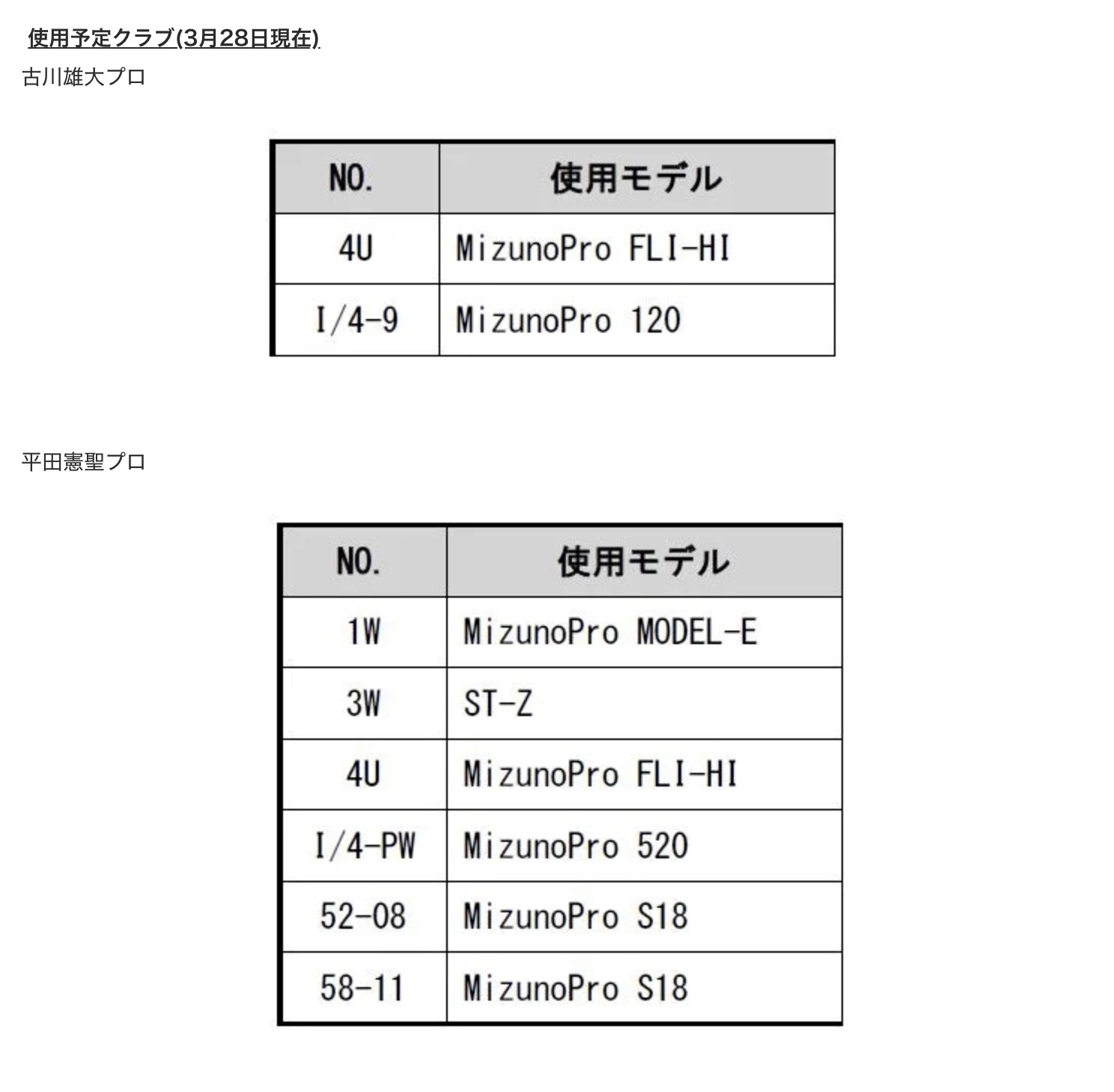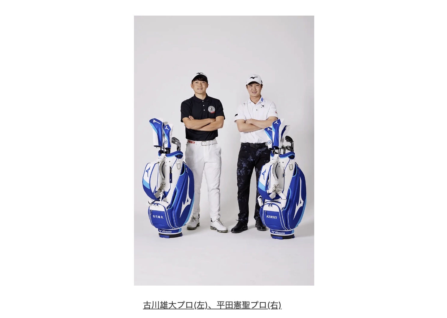今回の契約により、古川プロと平田プロはミズノ製ゴルフクラブとキャディバッグなどのゴルフ用具やヘッドウエア(キャップ)を使用します。また、ミズノゴルフ品に関する改良や開発に対するアドバイスを頂くと共に、宣伝・広報活動にも協力いただきます。