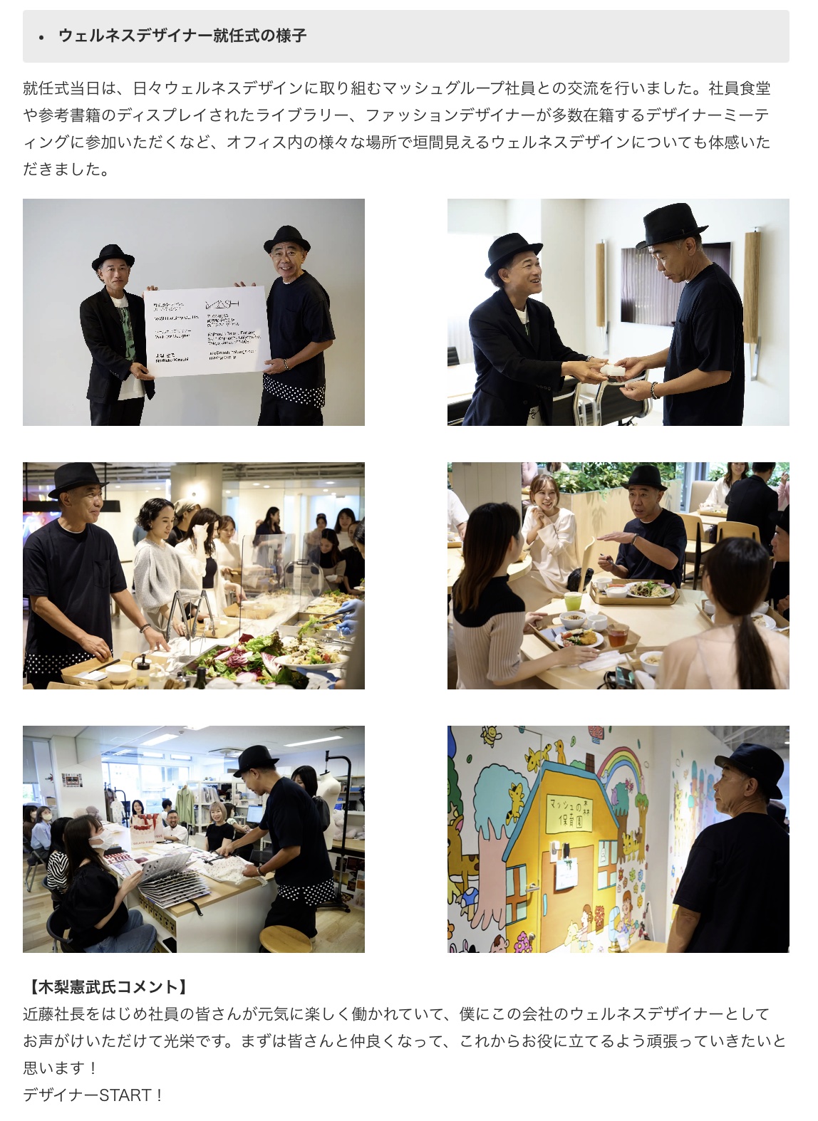 今回の就任に際し、就任当日となる5月22日(月)にマッシュグループ本社において『ウェルネスデザイナー就任式』を開催し、ものづくりに携わる社員との交流やオフィス視察を実施しました。