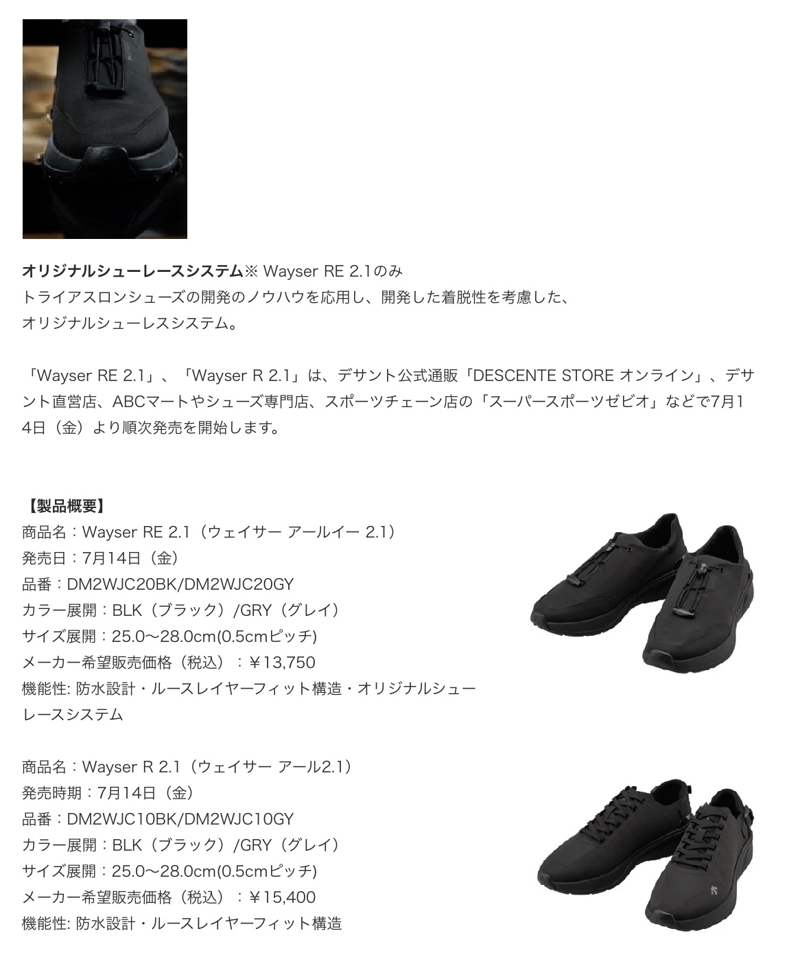 デサントジャパン株式会社が展開する『デサント』ブランドより、スポーツウェアが持つ機能性や着心地の良さを目指し、当社のスポーツウェア開発の技術を応用して開発した防水スニーカーWayserシリーズの第2弾となる「Wayser RE 2.1(ウェイサー アールイー 2.1)」、「Wayser R 2.1」(ウェイサー アール 2.1)」を7月14日(金)に発売します。「快適の未来へ。Step into the Future of Comfort.」をコンセプトとし、第1弾の機能性、快適さを引き継ぎ、新たにソールを厚くすることで、より快適な履き心地を実現しアクティブなシーンでの着用にも対応する防水スニーカーです。