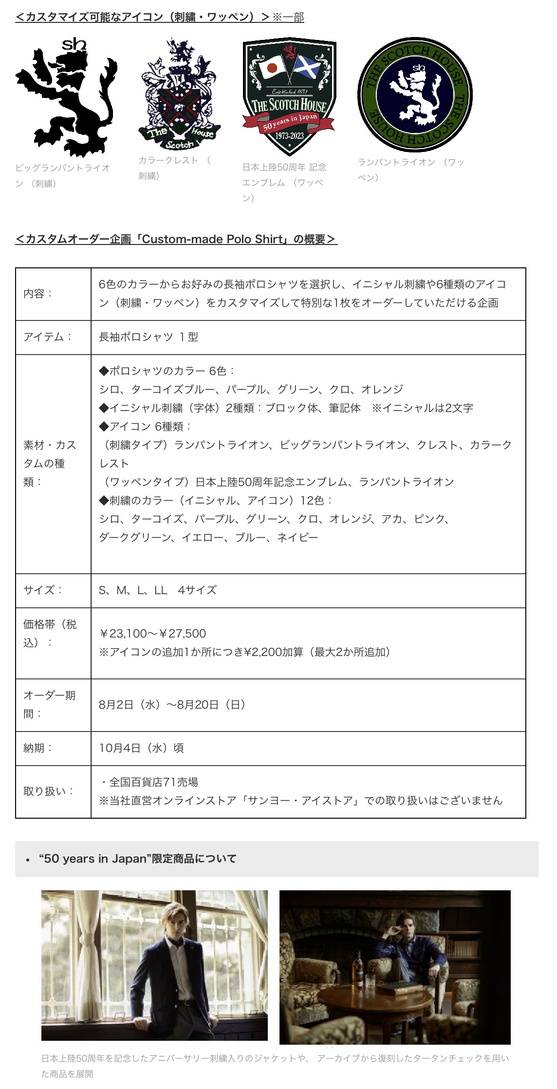 三陽商会が展開しているスコットランドがルーツの紳士服ブランド「THE SCOTCH HOUSE(ザ・スコッチハウス)」は、2023年で日本上陸50周年を迎えたことを記念し、カスタムメイドの長袖ポロシャツをオーダーできるキャンペーン「Custom-made Polo Shirt(カスタムメードポロシャツ)」を8月2日(水)~8月20日(日)の期間、全国百貨店71店舗で開催いたします。