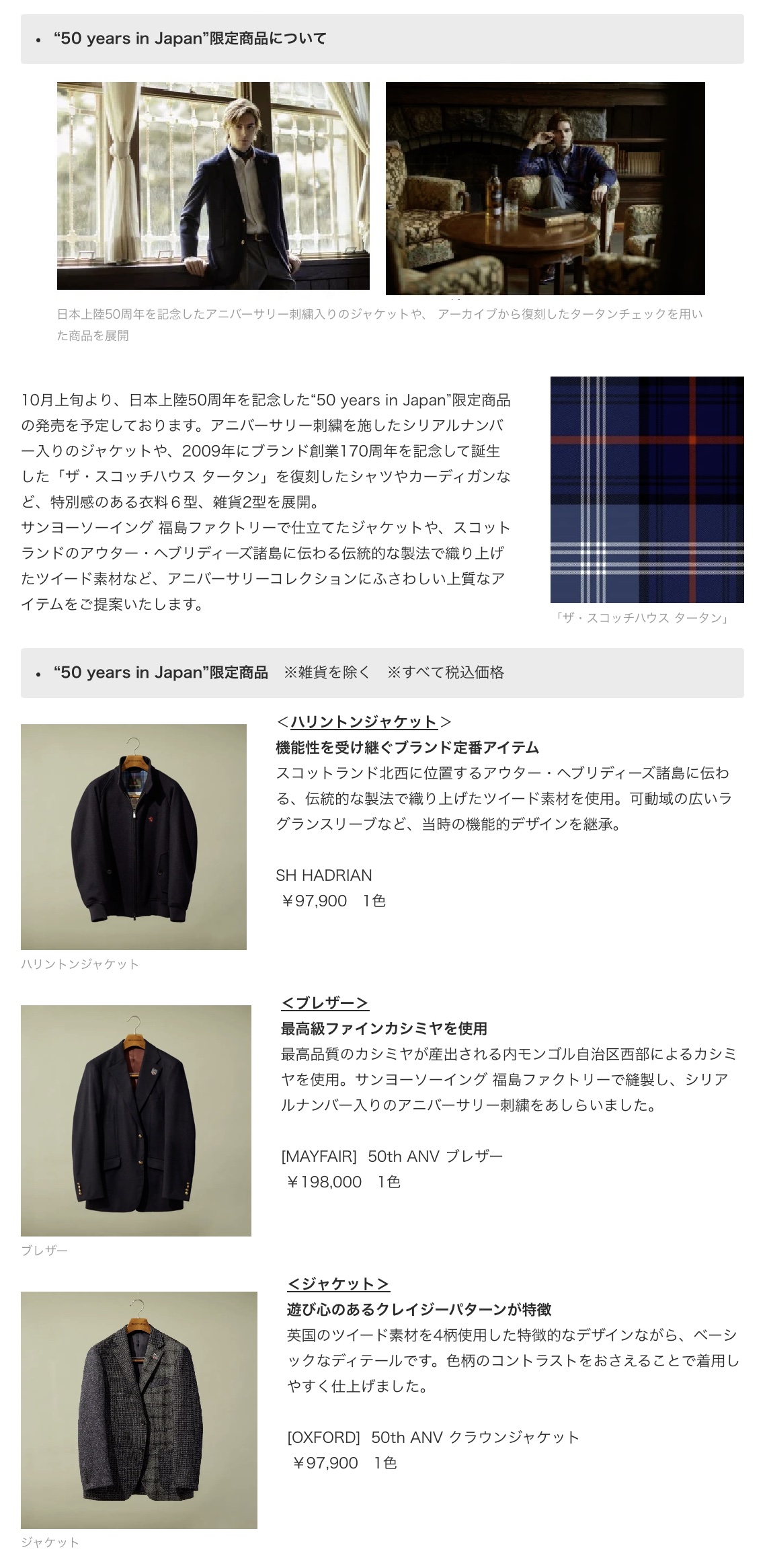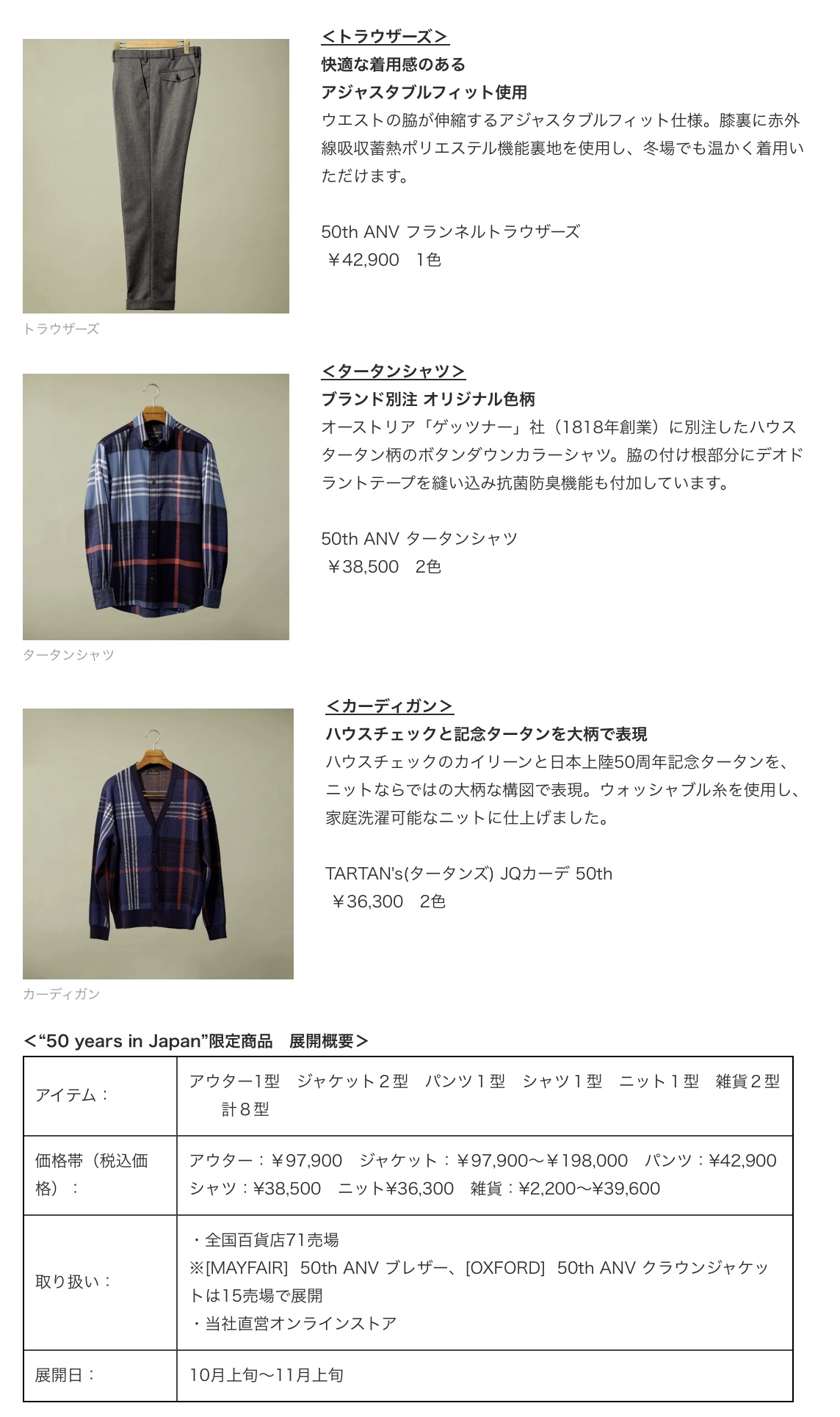 また、10月上旬頃よりジャケットやシャツなど6型、雑貨2型から成る“50 years in Japan”限定商品の発売を予定しており、「ザ・スコッチハウス」では秋冬シーズンを通して日本上陸50周年“50 years in Japan”を訴求いたします。