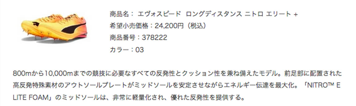 ラインアップは、去年から引き続き登場する「EVOSPEED DISTANCE NITRO ELITE+2(エヴォスピード ディスタンス ニトロ エリート+2)」をはじめ、新たに3モデル「EVOSPEED TOKYO NITRO (エヴォスピード トーキョー ニトロ)」、「EVOSPEED TOKYO NITRO 400 (エヴォスピード トーキョー ニトロ 400)」、「EVOSPEED LONGDISTANCE NITRO ELITE+2(エヴォスピード ロングディスタンス ニト ロ エリート+2)」が登場します。なお、この4モデル全てのスパイクには、プーマ独自のフォームテクノロジー「NITRO™️ FOAM(ニトロ フォーム)」が搭載されており、高い反発性とクッション性を兼ね備えながらも軽量化を実現しています。