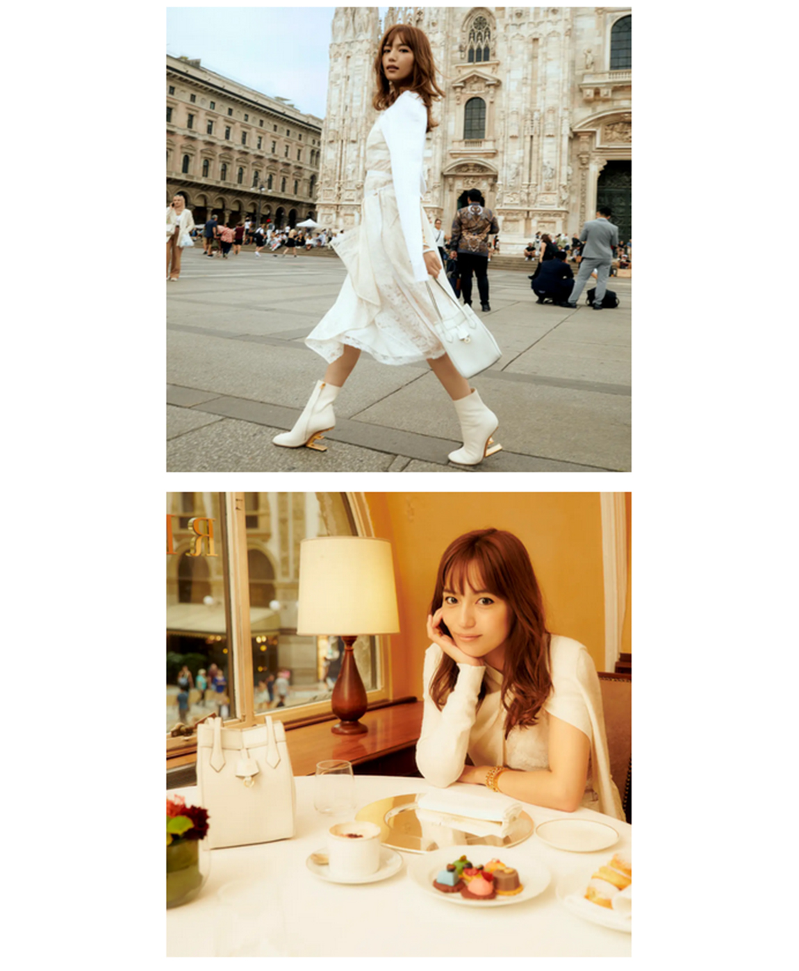 その後、アイコニックな美しいアーケードに囲まれたフェンディのガレリアブティックや、壮大な存在感を放つミラノ大聖堂(ドゥオーモ)など、ミラノを代表する歴史的な建造物のエネルギーを肌で感じました。さらに、ガレリアを一望できるカフェではリラックスしたティータイムに覗かせる穏やかな表情をとらえ、タイムレスな魅力にあふれた街・ミラノを堪能した姿が動画内に収められています。