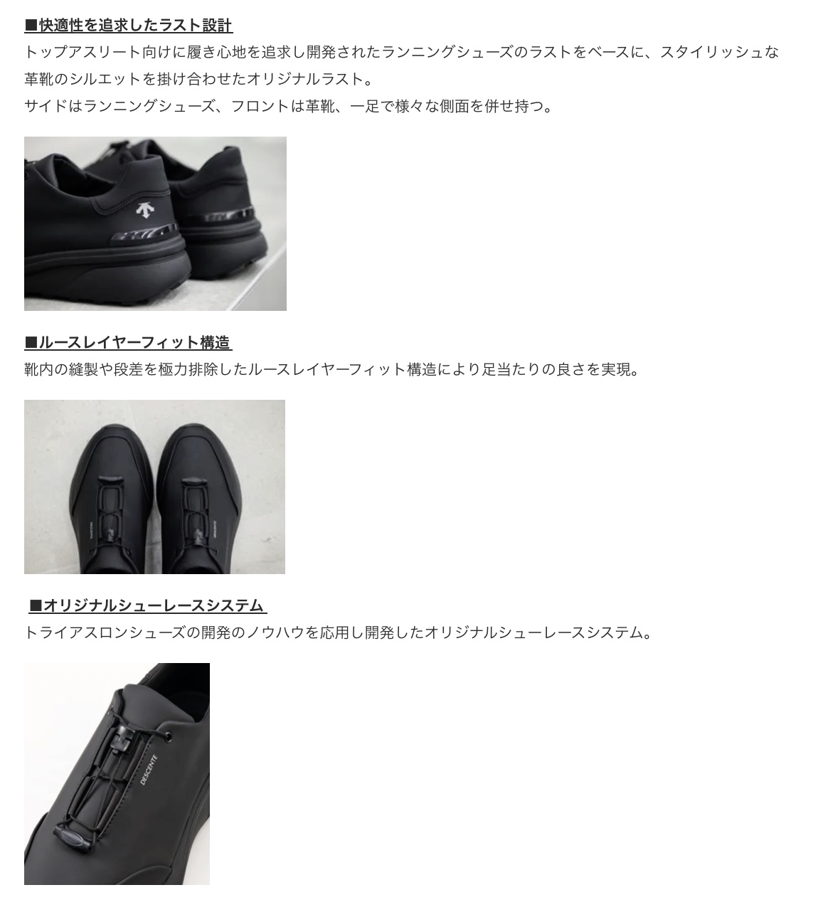 さらに、『デサント』のトライアスロン用シューズ「DELTA(デルタ)」の技術も応用し、靴内の縫製や段差を極力排除した「ルースレイヤーフィット構造」を採用することで足当たりを軽減し、また、自転車からランニングに移る際に素早く靴を履かなくてはならないトライアスロンの競技特性から誕生したシューレースシステムも採用する等、当社がトップ選手向けに開発した技術が注ぎ込まれています。