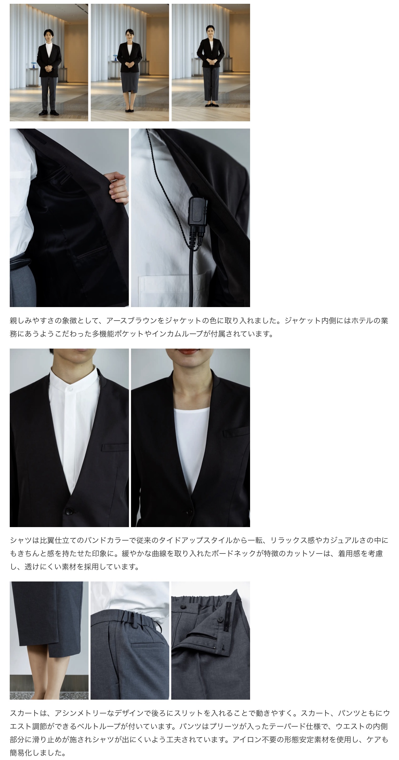 また、「親しみやすさ(ユーザーフレンドリー)」、「多様性(多様な価値観を尊重できるデザイン)」、「サステナビリティ(環境配慮素材の使用)」の要素を取り入れたいといった両ホテルのリクエストに対し、ジャケット、シャツ、カットソー、パンツ、スカートのトータルコーディネートを提案しました。ご自身で自由にスタイルを選択できるのも特徴です。軽量・機能性素材を取り入れることで着用するスタッフ皆様の着心地や作業効率も改善。さらに、全アイテムの表地にリサイクルペットボトル素材を使用するとともに、着用後は産業廃棄物にするのではなく新たな資源として生まれ変わらせるマテリアルリサイクル(※)を行うサステナブルなユニフォームを実現しました。