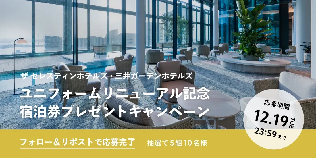 ユニフォームリニューアルを記念して、当社公式X(旧Twitter)において抽選で5組10名様に、「ザ セレスティンホテルズ」「三井ガーデンホテルズ」に加えて系列の「sequence」もご利用いただける「宿泊ペアチケット」が当たるプレゼントキャンペーンを実施します。