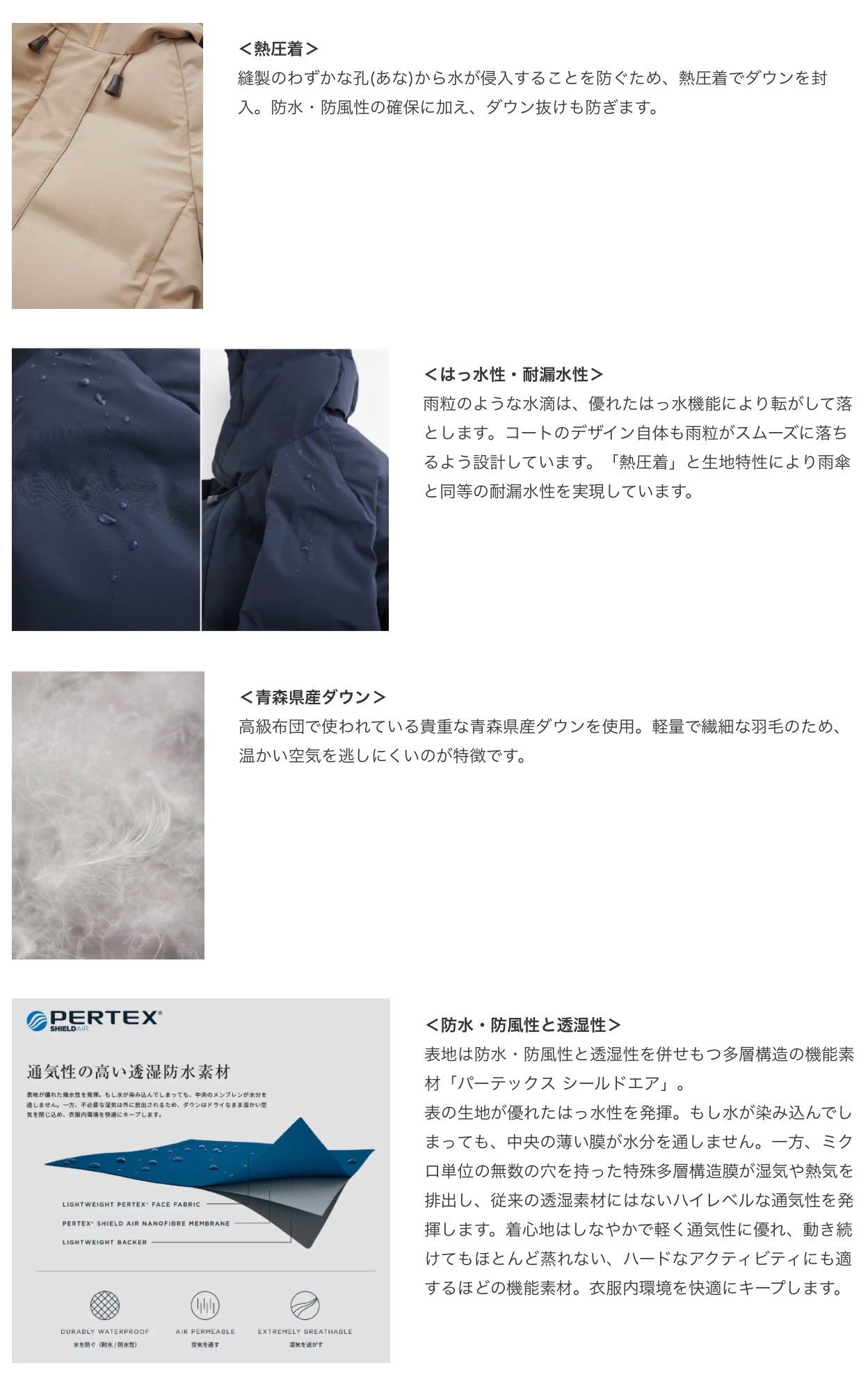 ②仕様・機能・素材:「熱圧着」無縫製技術、「防水・防風・透湿性」機能素材、温かい空気を逃しにくい「青森県産ダウン」を採用。雨傘と同等の耐漏水性を実現