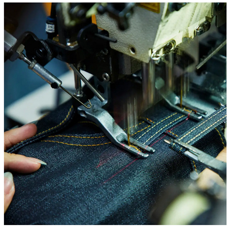 エドウイン専用に独自開発・カスタマイズされた様々なミシンや自動機を使い、細部に至るまで「門外不出」としているきめ細かい約束事を頑なに守ることで作られている。