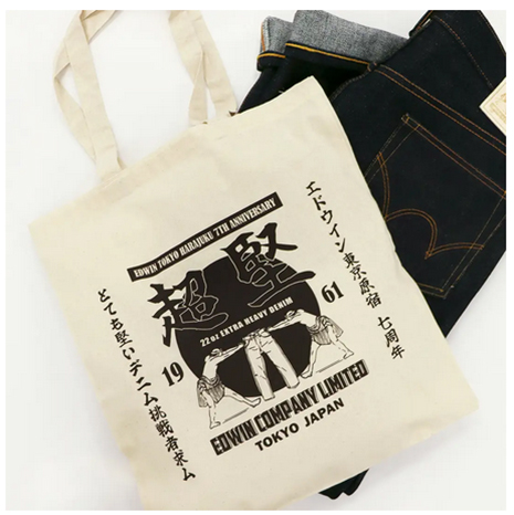 限定ノベルティとして、7周年記念「超堅ジーンズ」をご購入いただいた方にはもれなく特製トートバッグをプレゼント。革ラベルのデザインがプリントされた限定品。