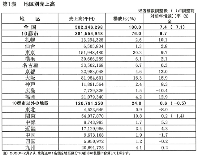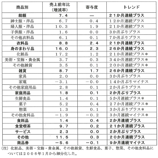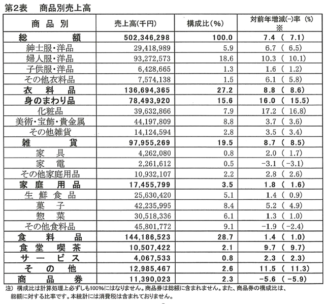 11月の全国百貨店(72社180店舗)の売上高総額は5,023億円となり、前年同月比7.4%であった。主力の衣料品売上高は1,367億円で、21か月連続プラス。中旬以降の気温低下により、防寒衣料品等季節商材が好調に推移したことによる。
