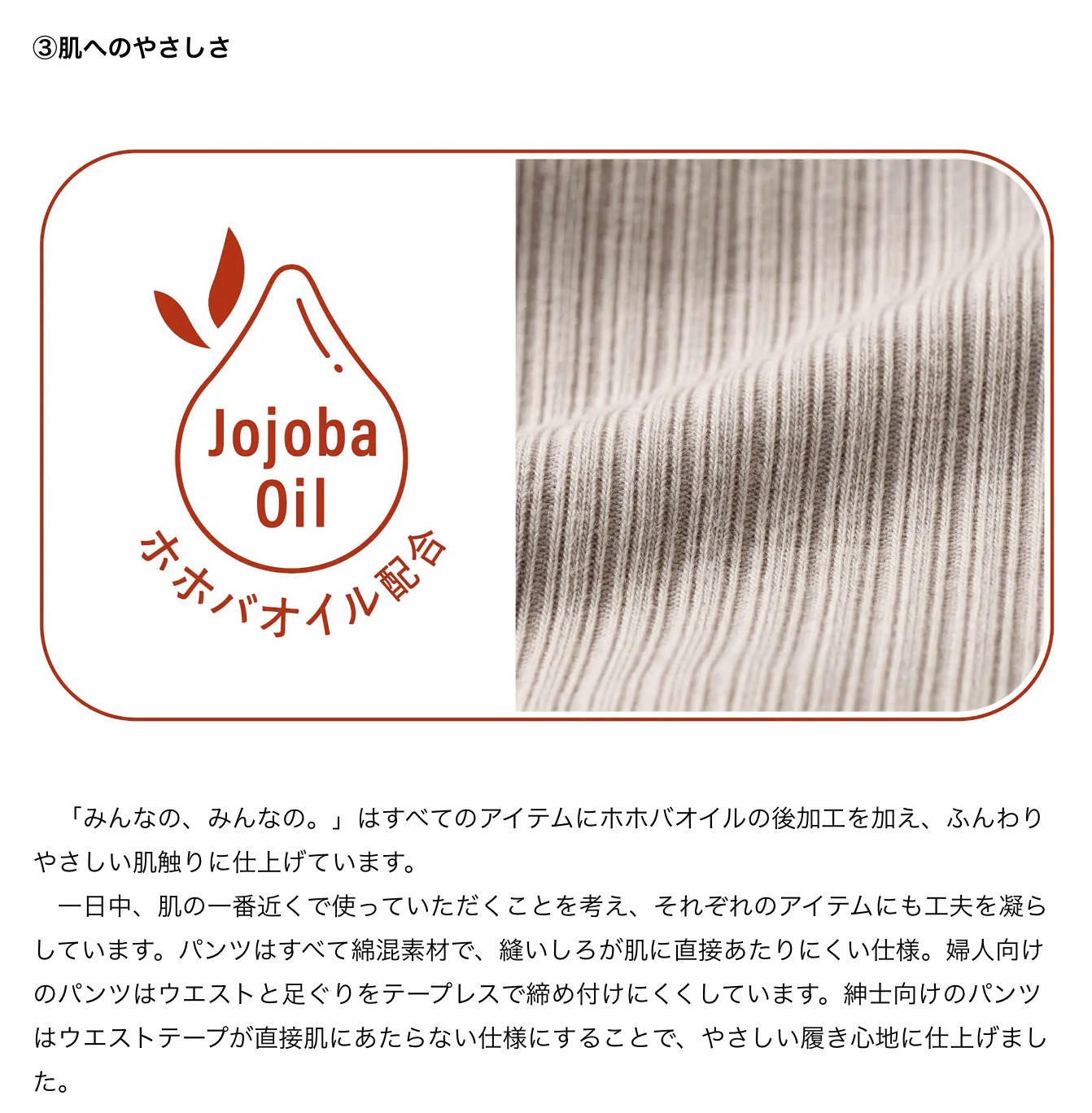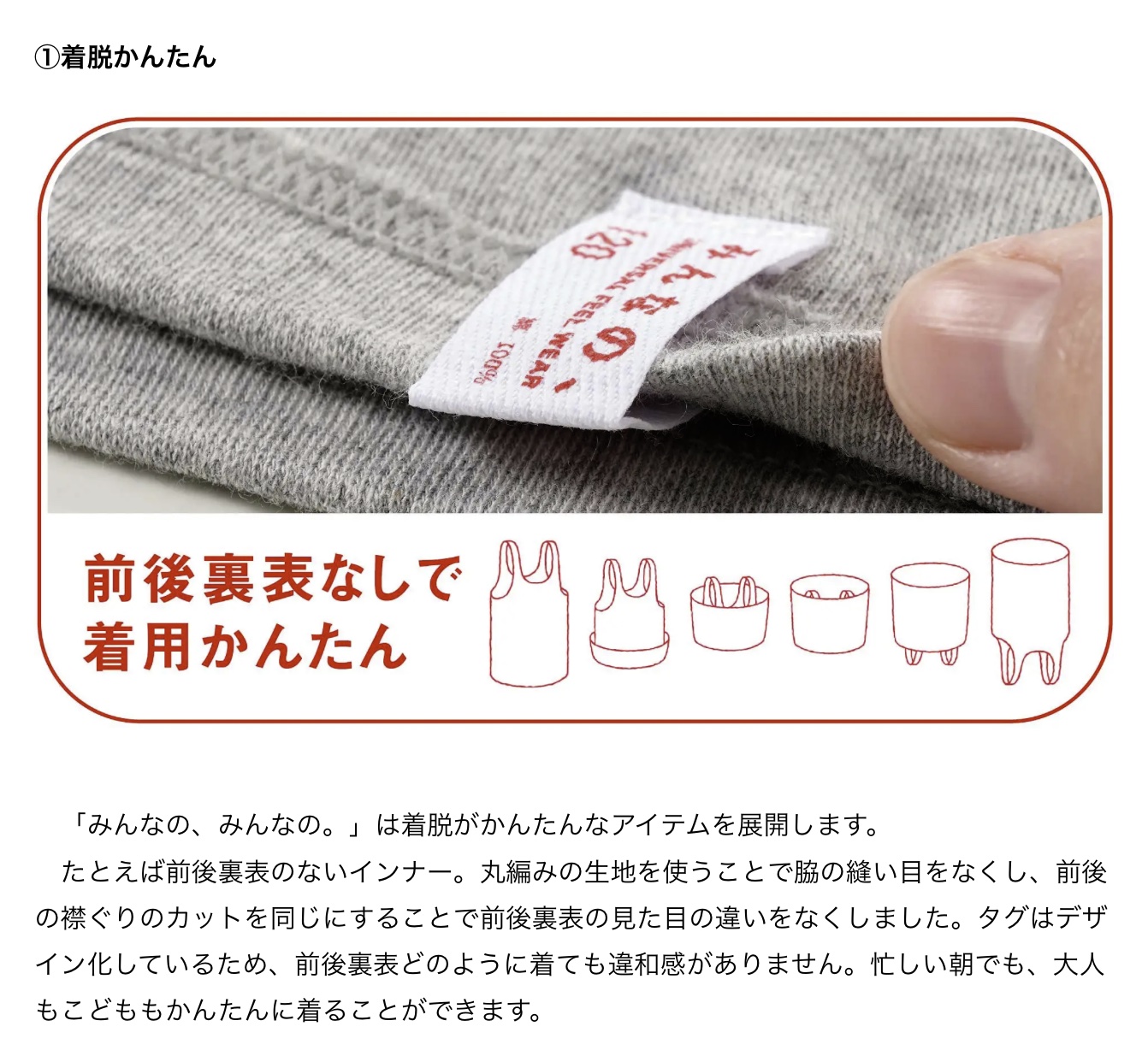 年齢や性別、生活スタイルを問わず、誰もが毎日をより楽に、より楽しく過ごすために新ブランド「みんなの、みんなの。」は生まれました。「みんなの、みんなの。」は「着脱かんたん」「洗濯後もらくらく」「肌へのやさしさ」「環境へのやさしさ」という4つのブランドベネフィットを掲げ、着心地も、扱いも楽ちんでハッピーなアイテムをSSから3Lまでの幅広いサイズで展開いたします。