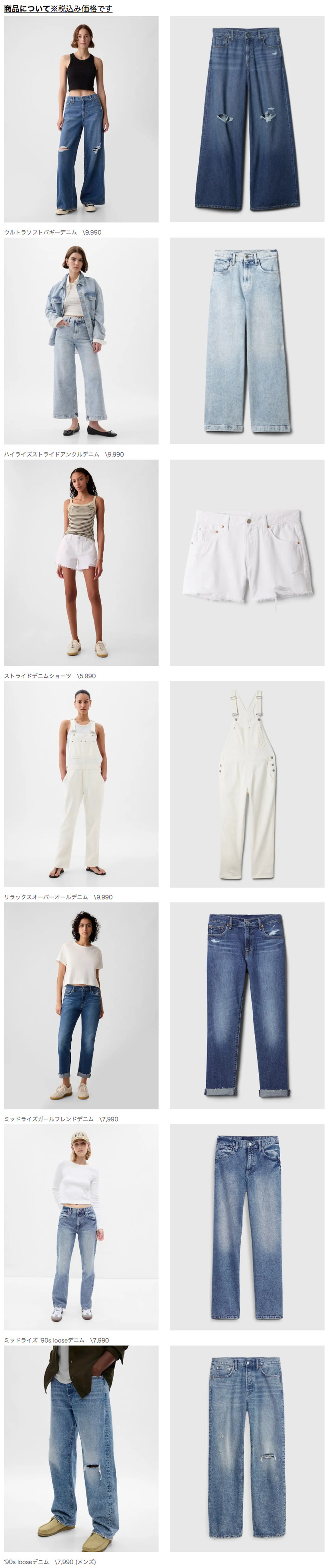 ウィメンズデニムの価格帯は、\5,990~\13,900(税込み)で全国のGapストアと公式オンラインストア( https://www.gap.co.jp/ )で販売しています。