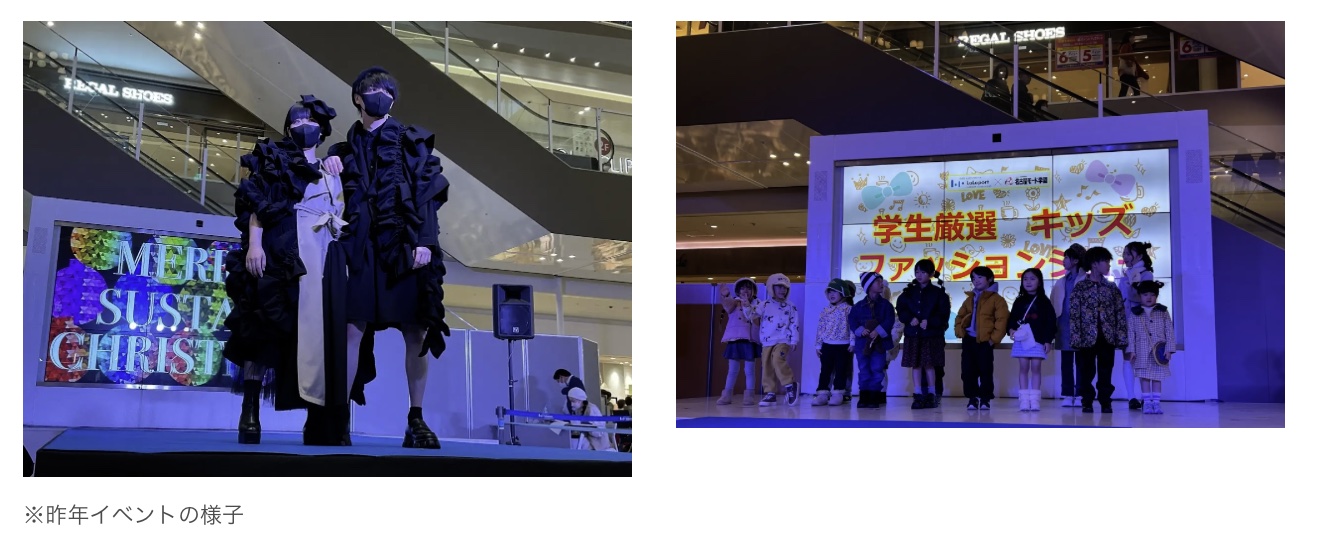 昨年に続き、愛知県と縁ある「繊維産業」と「学生の創作力」のコラボレーションによるイベントで、今回はファッションショーと体験イベントを開催いたします。ファッションショーでは、名古屋の繊維商社である瀧定名古屋株式会社が尾州産地で生産しているリサイクルウール素材『RE:NEWOOL(リニュール)®』を使用した学生オリジナル作品等、計21作品をランウェイで発表します。さらに、事前に募集したキッズモデルをメイク・ネイル学科の学生がヘアメイクし、ららぽーと名古屋みなとアクルス内のキッズテナントショップで販売している商品でコーディネートするキッズファッションショーも実施いたします。