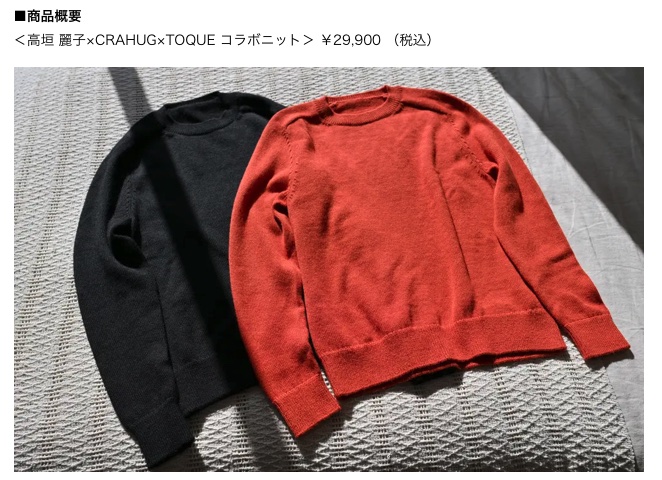 今回のコラボレーションは、かねてより日本のものづくりに関心を寄せていた高垣さんが、素材やものづくりにこだわる「TOQUE」 のブランドの世界観や「CRAHUG」のコンセプトに共感したことから、「TOQUE」の天然繊維ならではの肌馴染みの良さや、心地良い安心感などの魅力を消費者に伝えるべく始動し、実現に至りました。永く愛用できるようにトレンド感をあえて抑えめにしたベーシックなデザインのニットは、希少性の高いベビーアルパカを100%使用し、「編み上げ」「洗い」「乾燥」に至るまで全ての工程を日本国内で一貫して仕上げています。高垣さんこだわりのオリジナルカラーは、ご自身が感動をもらった、石川県能登半島の現地での情景から着想を得ています。
