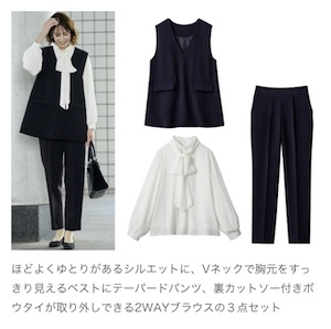 ほどよくゆとりがあるシルエットに、Vネックで胸元をすっきり見えるベストにテーパードパンツ、裏カットソー付きボウタイが取り外しできる