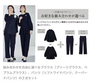 組み合わせを自由に選べるブラウス(プリーツブラウス、ペプラムブラウス)、パンツ(ソフトワイドパンツ、テーパードパンツ)の2点セット