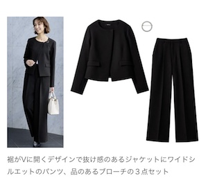 裾がVに開くデザインで抜け感のあるジャケットにワイドシルエットのパンツ、品のあるブローチの3点セット 3点セットデザインジャケット+パンツ 価格/19,990円(税込) カラー/1色(ブラック) サイズ/4サイズ(S、M、L、LL)×股下2サイズ(66、70cm) URL/https://www.bellemaison.jp/cpg/prr/pr_1258127/