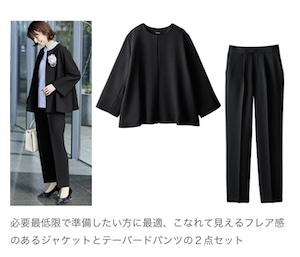 必要最低限で準備したい方に最適、こなれて見えるフレア感のあるジャケットとテーパードパンツの2点セット