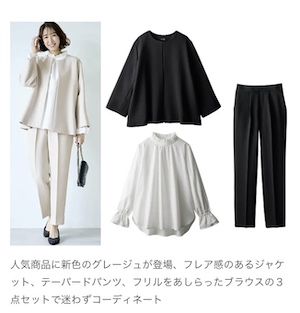 人気商品に新色のグレージュが登場、フレア感のあるジャケット、テーパードパンツ、フリルをあしらったブラウスの3点セットで迷わずコーディネート